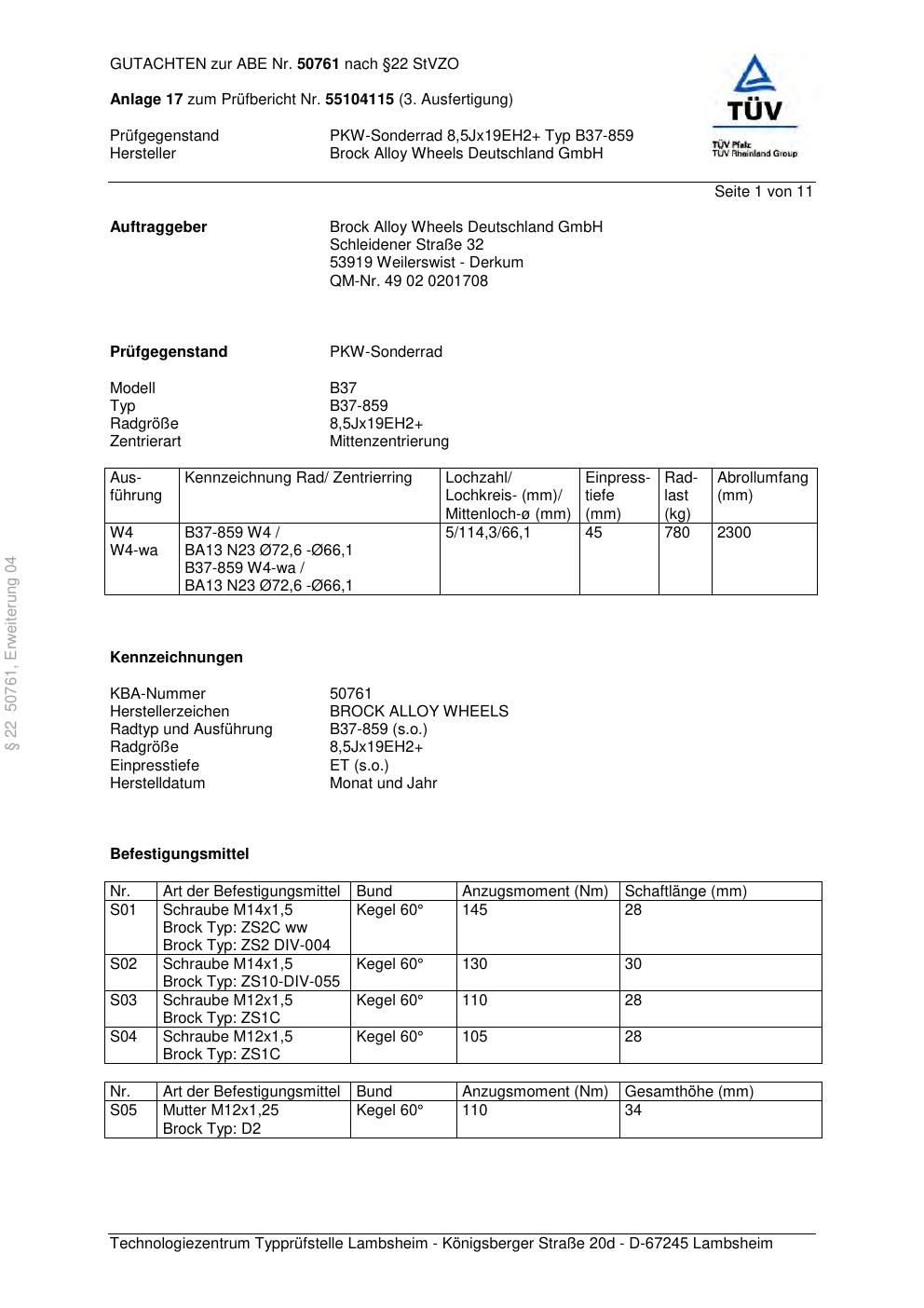 Dieses Gutachten (abe) bezieht sich auf die Alufelge Brock B37-859 in der Ausführung ET 0, Mittenloch 0 mm (KBA 50761). Im PDF findest du typischerweise zulässige Reifengrößen, Auflagen/Anbauhinweise und – je nach Dokument – Hinweise zur Eintragung.