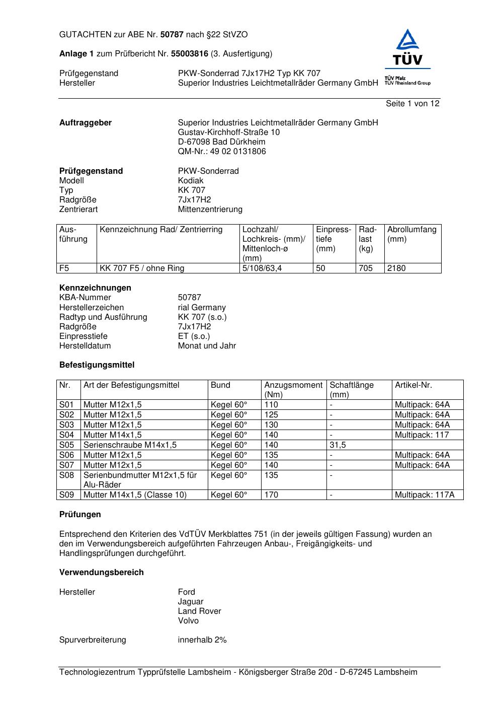 Dieses Gutachten (abe) bezieht sich auf die Alufelge brand-rial KK 707 in der Ausführung 7Jx17 ET 0, Mittenloch 0 mm (KBA 50787). Im PDF findest du typischerweise zulässige Reifengrößen, Auflagen/Anbauhinweise und – je nach Dokument – Hinweise zur Eintragung.