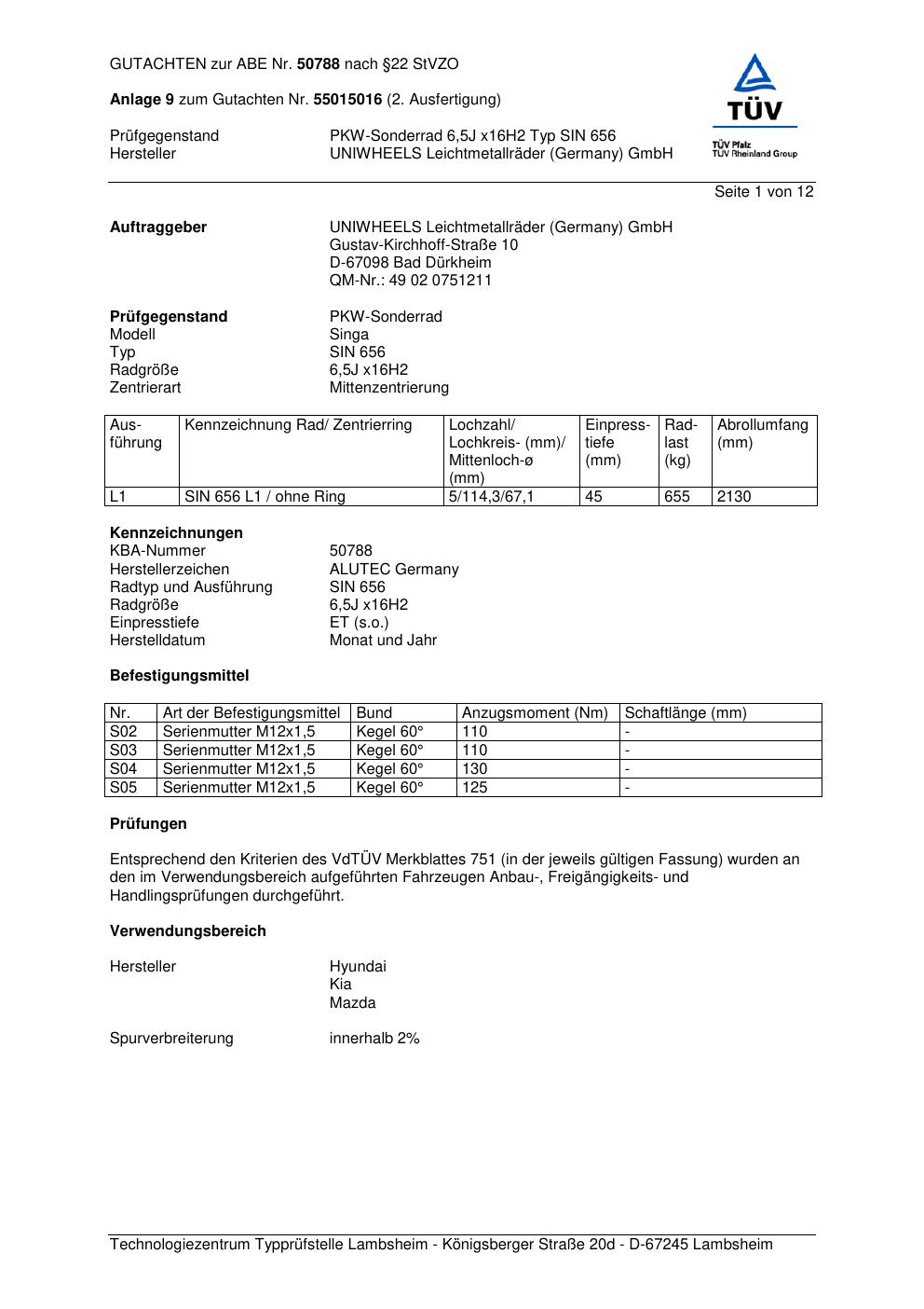 Felgengutachten / abe für Alufelgen ALUTEC SIN 656 (6.5Jx16 ET 0, Mittenloch 0 mm) mit KBA 50788 (Zertifikatsnummer 50788). Hier kostenlos als PDF herunterladen. Der Download-Link ist 24 Stunden gültig und kann bis zu zwei Mal verwendet werden.