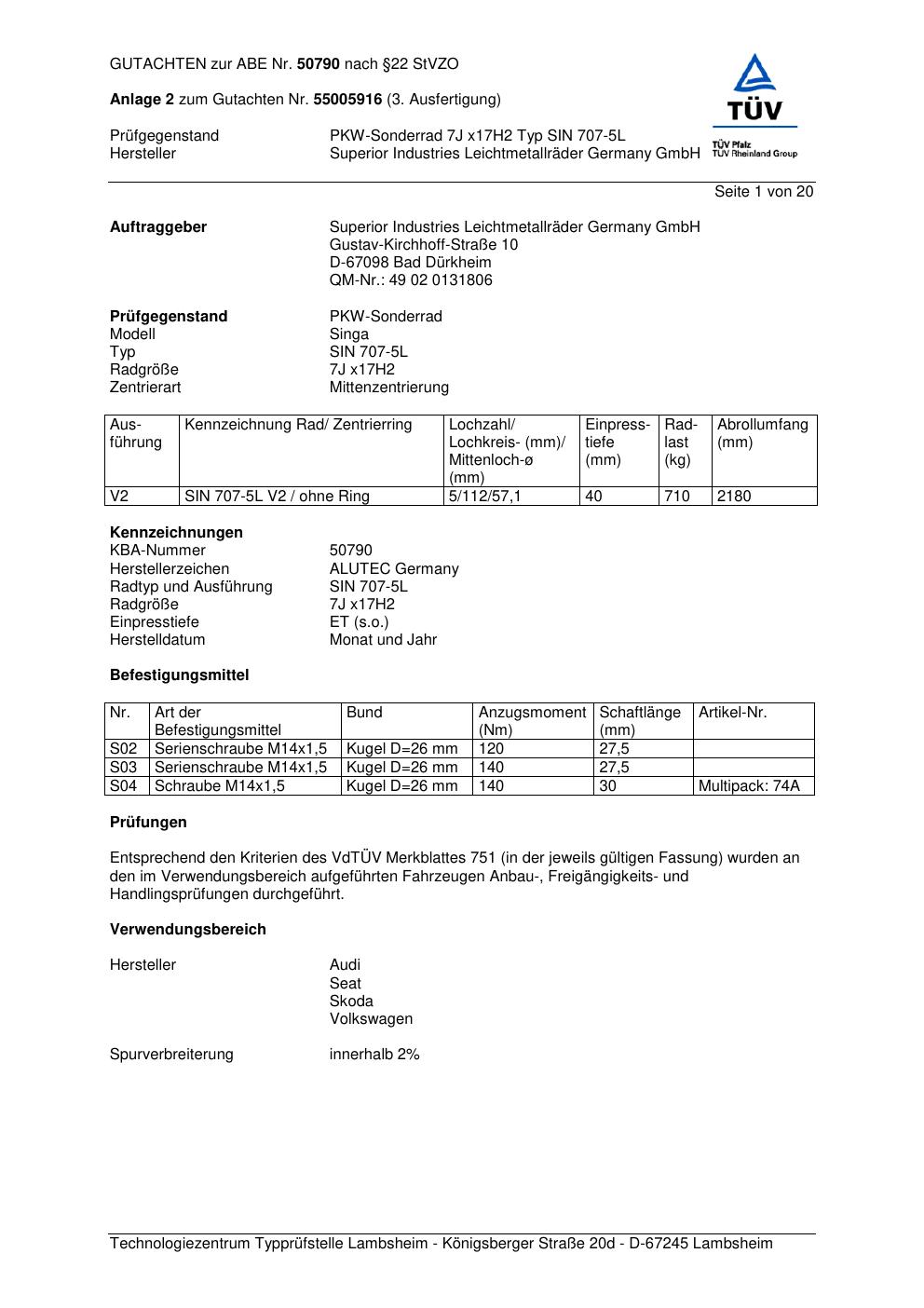 Dieses Gutachten (abe) bezieht sich auf die Alufelge ALUTEC SIN 707-5 L in der Ausführung 7Jx17 ET 0, Mittenloch 0 mm (KBA 50790). Im PDF findest du typischerweise zulässige Reifengrößen, Auflagen/Anbauhinweise und – je nach Dokument – Hinweise zur Eintragung.