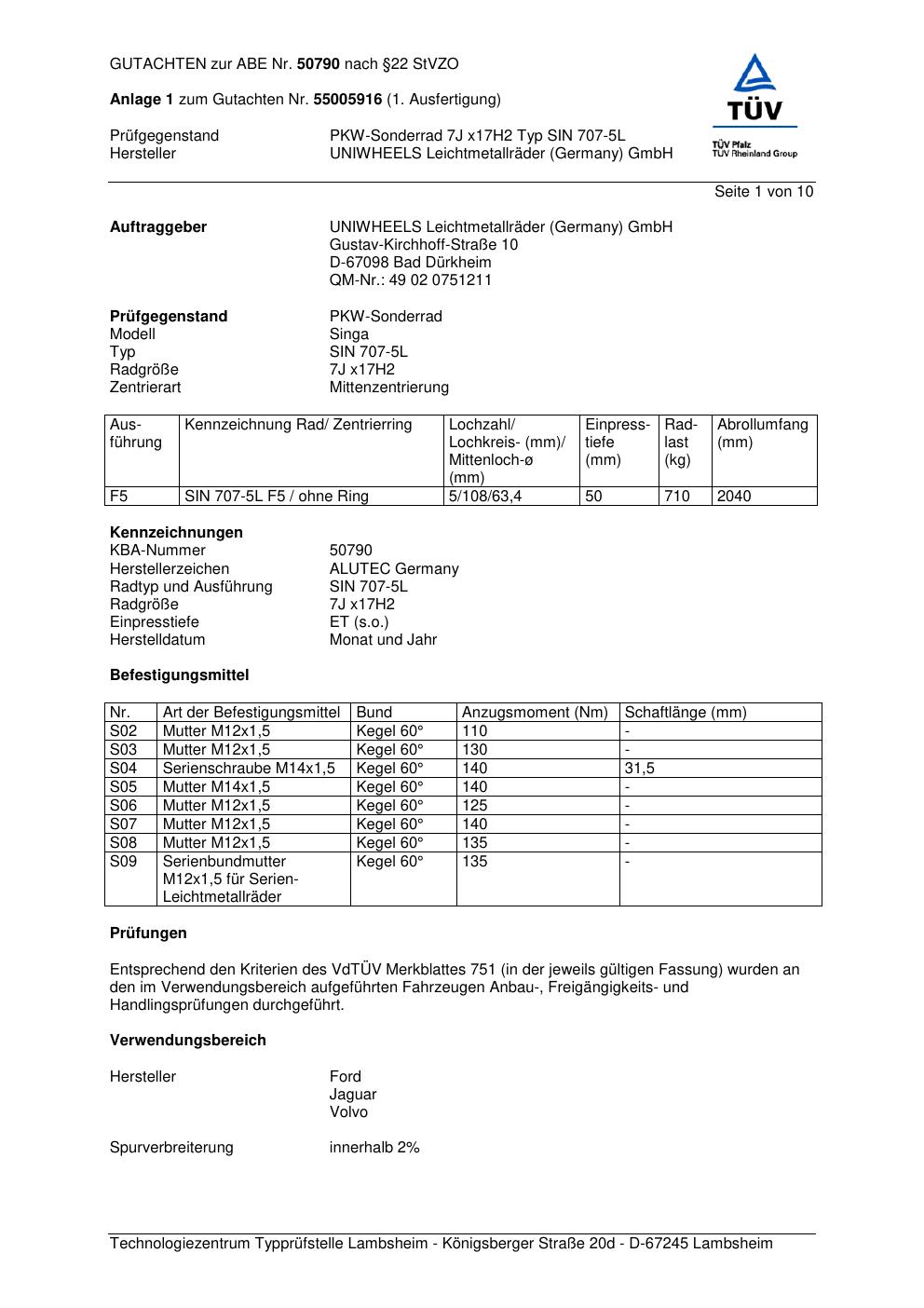 Dieses Gutachten (abe) bezieht sich auf die Alufelge ALUTEC SIN 707-5 L in der Ausführung 7Jx17 ET 0, Mittenloch 0 mm (KBA 50790). Im PDF findest du typischerweise zulässige Reifengrößen, Auflagen/Anbauhinweise und – je nach Dokument – Hinweise zur Eintragung.