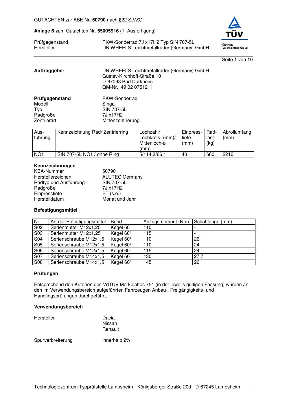 Dieses Gutachten (abe) bezieht sich auf die Alufelge ALUTEC SIN 707-5 L in der Ausführung 7Jx17 ET 0, Mittenloch 0 mm (KBA 50790). Im PDF findest du typischerweise zulässige Reifengrößen, Auflagen/Anbauhinweise und – je nach Dokument – Hinweise zur Eintragung.