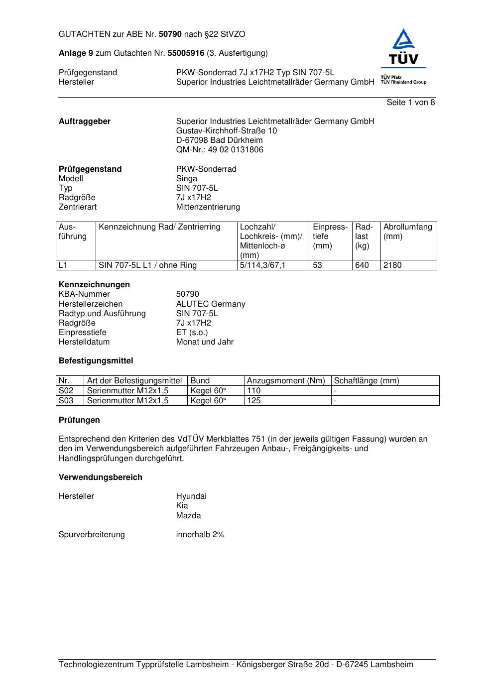 Dieses Gutachten (abe) bezieht sich auf die Alufelge ALUTEC SIN 707-5 L in der Ausführung 7Jx17 ET 0, Mittenloch 0 mm (KBA 50790). Im PDF findest du typischerweise zulässige Reifengrößen, Auflagen/Anbauhinweise und – je nach Dokument – Hinweise zur Eintragung.