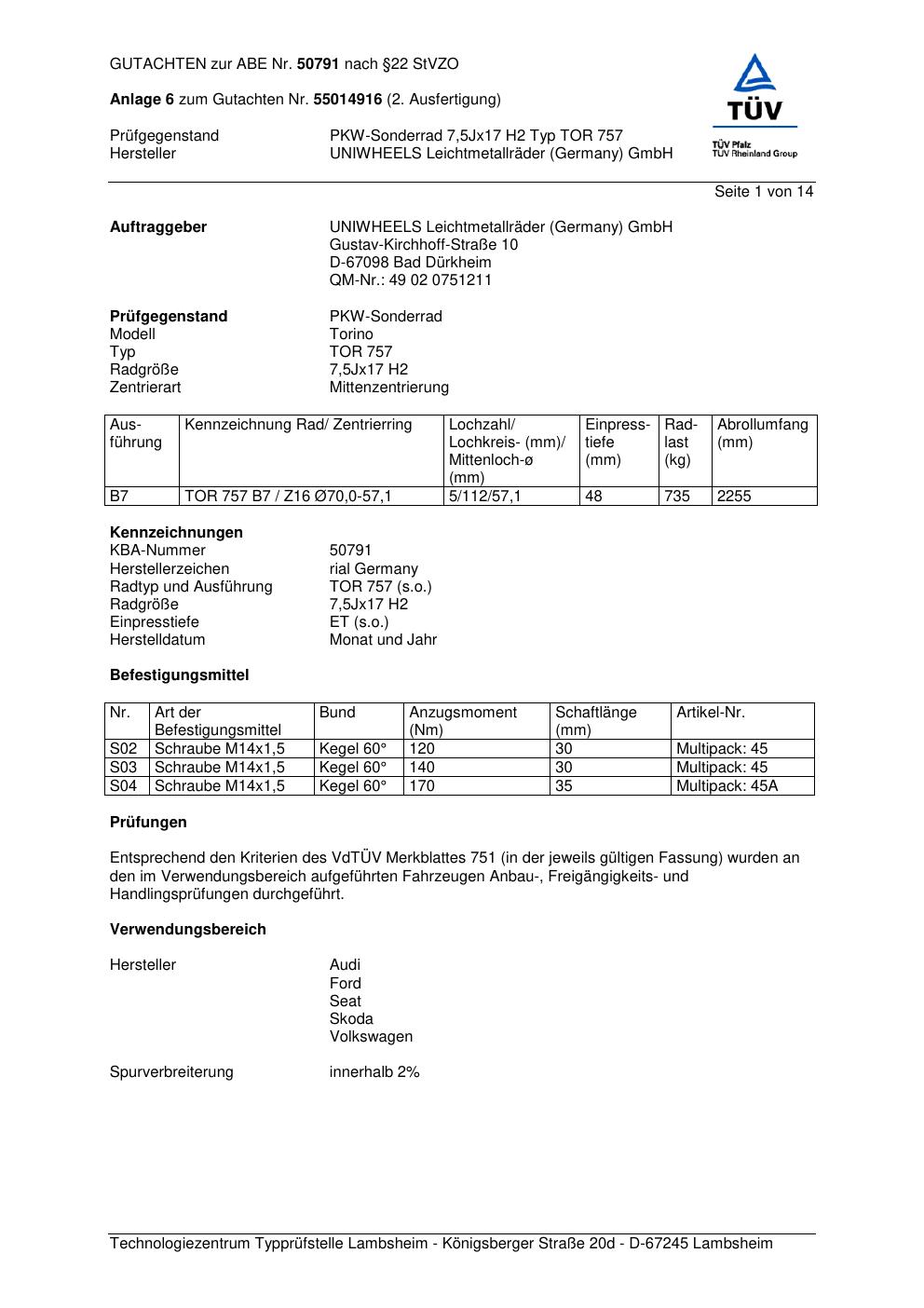 Felgengutachten / abe für Alufelgen Rial TOR 757 (7.5Jx17 ET 0, Mittenloch 0 mm) mit KBA 50791 (Zertifikatsnummer 50791). Hier kostenlos als PDF herunterladen. Der Download-Link ist 24 Stunden gültig und kann bis zu zwei Mal verwendet werden.