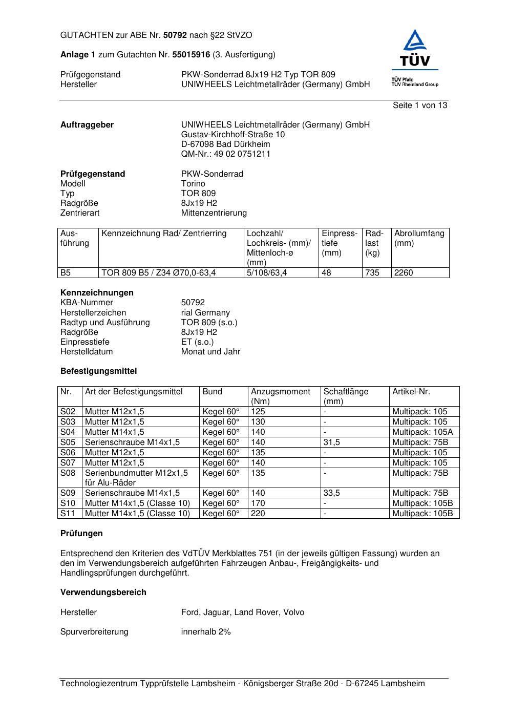 Dieses Gutachten (abe) bezieht sich auf die Alufelge brand-rial TOR 809 in der Ausführung 8Jx19 ET 0, Mittenloch 0 mm (KBA 50792). Im PDF findest du typischerweise zulässige Reifengrößen, Auflagen/Anbauhinweise und – je nach Dokument – Hinweise zur Eintragung.