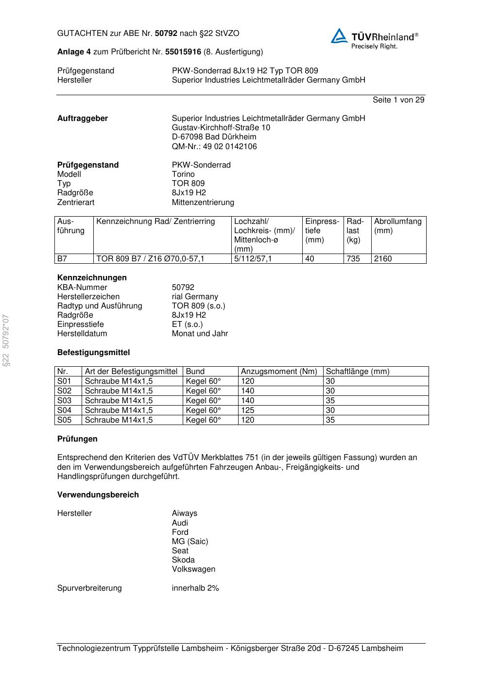 Dieses Gutachten (abe) bezieht sich auf die Alufelge brand-rial TOR 809 in der Ausführung 8Jx19 ET 0, Mittenloch 0 mm (KBA 50792). Im PDF findest du typischerweise zulässige Reifengrößen, Auflagen/Anbauhinweise und – je nach Dokument – Hinweise zur Eintragung.