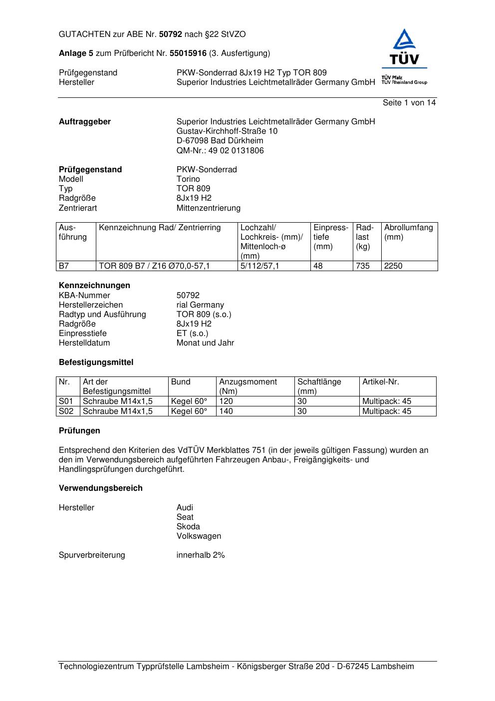 Dieses Gutachten (abe) bezieht sich auf die Alufelge brand-rial TOR 809 in der Ausführung 8Jx19 ET 0, Mittenloch 0 mm (KBA 50792). Im PDF findest du typischerweise zulässige Reifengrößen, Auflagen/Anbauhinweise und – je nach Dokument – Hinweise zur Eintragung.