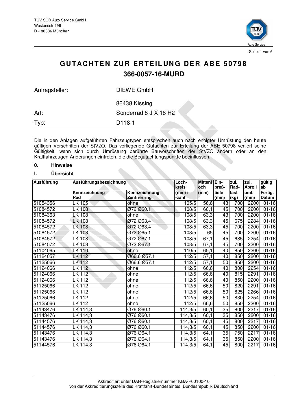 Dieses Gutachten (abe) bezieht sich auf die Alufelge Diewe D118 -1 in der Ausführung 8Jx18 ET 0, Mittenloch 0 mm (KBA 50798). Im PDF findest du typischerweise zulässige Reifengrößen, Auflagen/Anbauhinweise und – je nach Dokument – Hinweise zur Eintragung.
