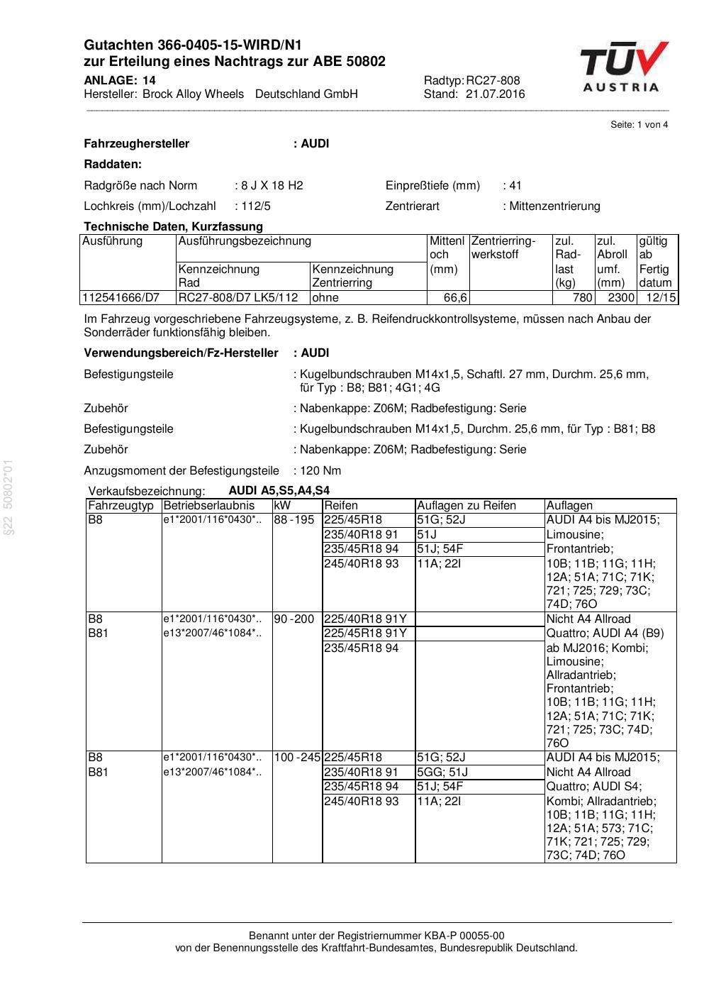 Felgengutachten / abe für Alufelgen Brock RC27-808 (8Jx18 ET 0, Mittenloch 0 mm) mit KBA 50802 (Zertifikatsnummer 50802). Hier kostenlos als PDF herunterladen. Der Download-Link ist 24 Stunden gültig und kann bis zu zwei Mal verwendet werden.