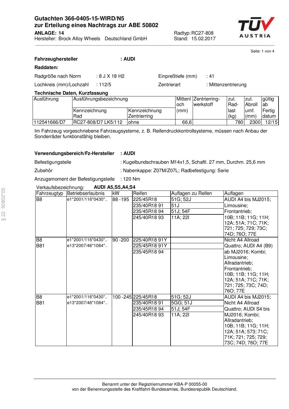 Dieses Gutachten (abe) bezieht sich auf die Alufelge Brock RC27-808 in der Ausführung 8Jx18 ET 0, Mittenloch 0 mm (KBA 50802). Im PDF findest du typischerweise zulässige Reifengrößen, Auflagen/Anbauhinweise und – je nach Dokument – Hinweise zur Eintragung.