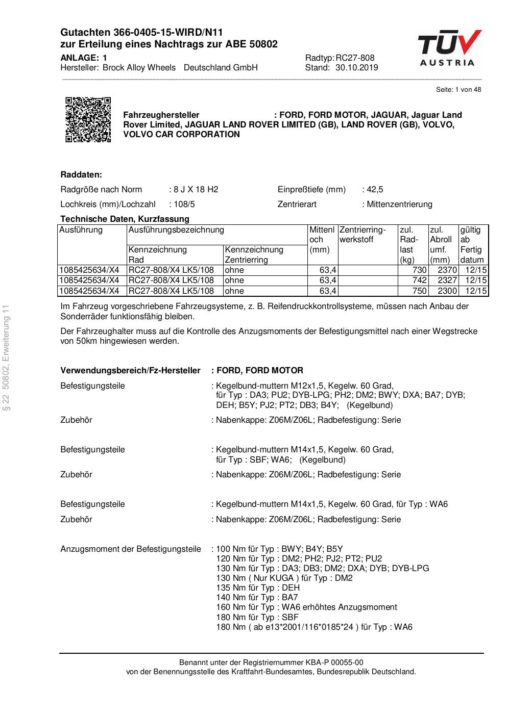 Dieses Gutachten (abe) bezieht sich auf die Alufelge Brock RC27-808 in der Ausführung 8Jx18 ET 0, Mittenloch 0 mm (KBA 50802). Im PDF findest du typischerweise zulässige Reifengrößen, Auflagen/Anbauhinweise und – je nach Dokument – Hinweise zur Eintragung.