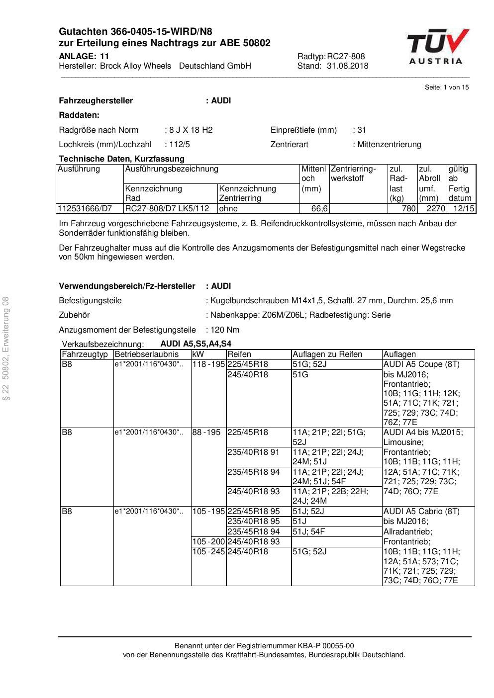 Dieses Gutachten (abe) bezieht sich auf die Alufelge Brock RC27-808 in der Ausführung 8Jx18 ET 0, Mittenloch 0 mm (KBA 50802). Im PDF findest du typischerweise zulässige Reifengrößen, Auflagen/Anbauhinweise und – je nach Dokument – Hinweise zur Eintragung.