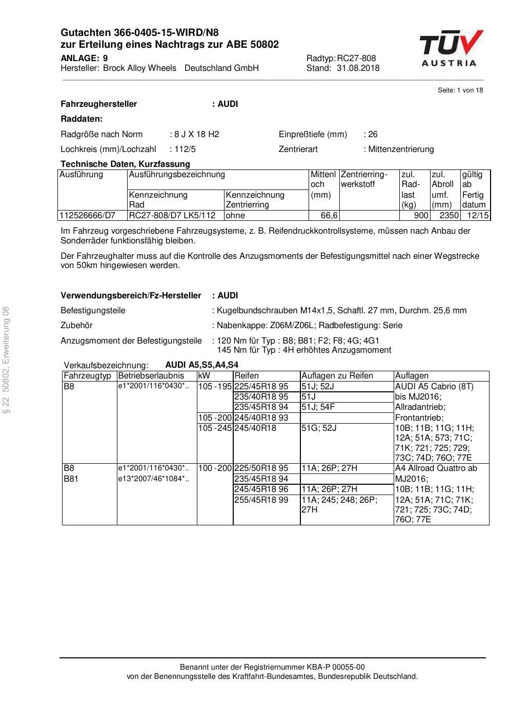 Dieses Gutachten (abe) bezieht sich auf die Alufelge Brock RC27-808 in der Ausführung 8Jx18 ET 0, Mittenloch 0 mm (KBA 50802). Im PDF findest du typischerweise zulässige Reifengrößen, Auflagen/Anbauhinweise und – je nach Dokument – Hinweise zur Eintragung.