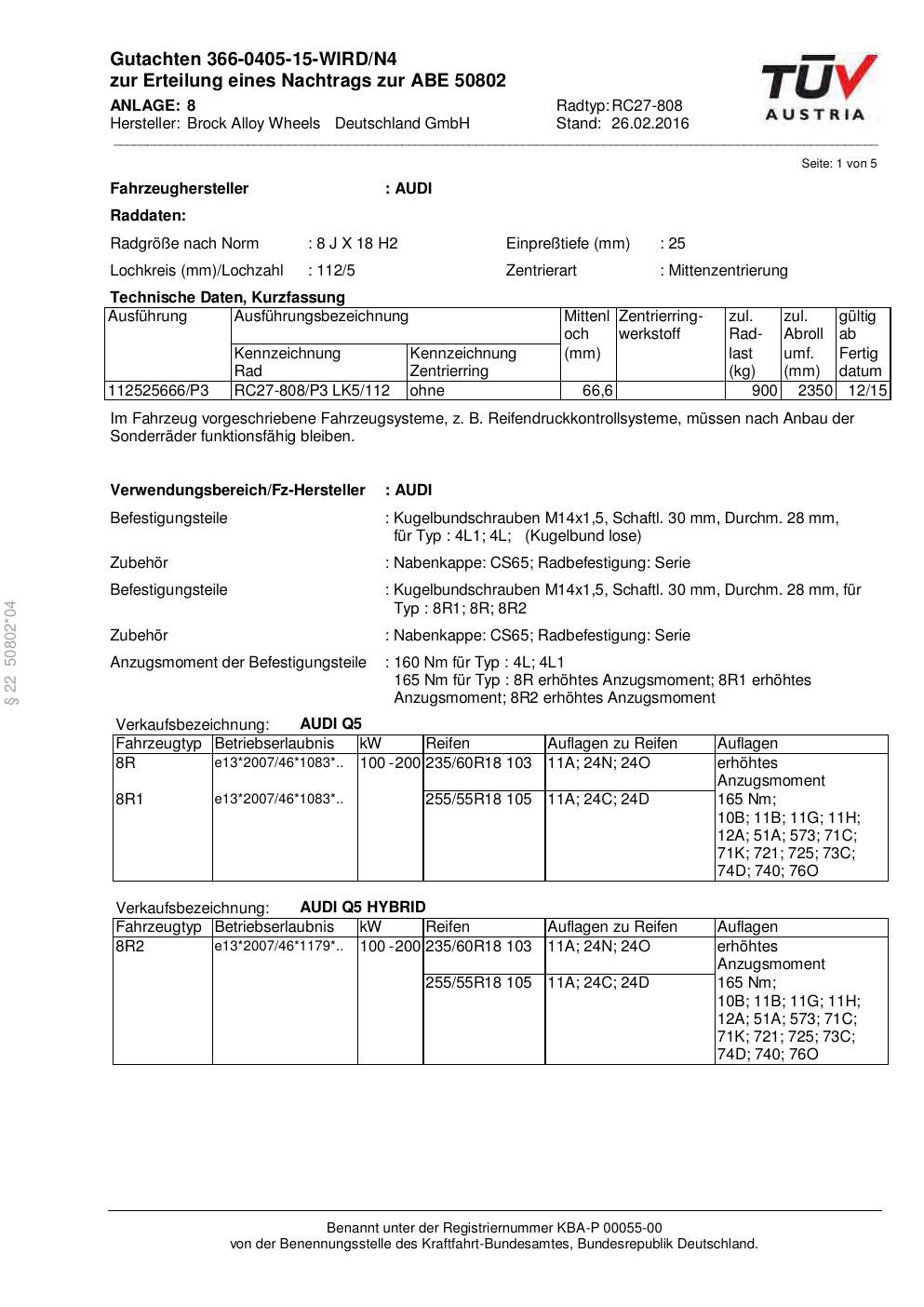 Dieses Gutachten (abe) bezieht sich auf die Alufelge Brock RC27-808 in der Ausführung 8Jx18 ET 0, Mittenloch 0 mm (KBA 50802). Im PDF findest du typischerweise zulässige Reifengrößen, Auflagen/Anbauhinweise und – je nach Dokument – Hinweise zur Eintragung.
