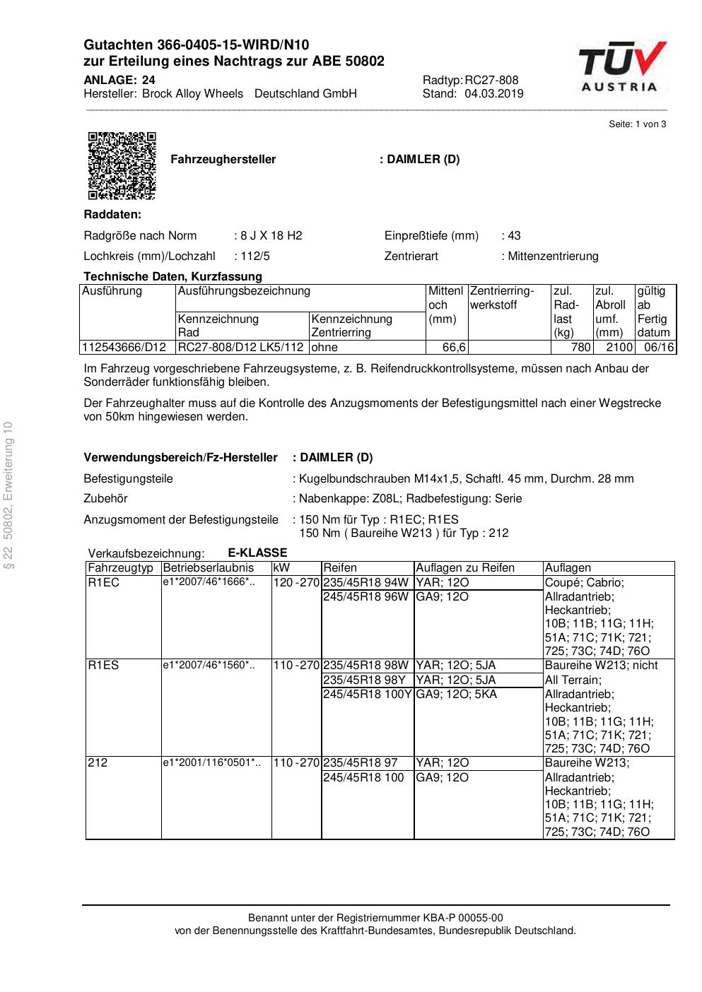 Dieses Gutachten (abe) bezieht sich auf die Alufelge Brock RC27-808 in der Ausführung 8Jx18 ET 0, Mittenloch 0 mm (KBA 50802). Im PDF findest du typischerweise zulässige Reifengrößen, Auflagen/Anbauhinweise und – je nach Dokument – Hinweise zur Eintragung.