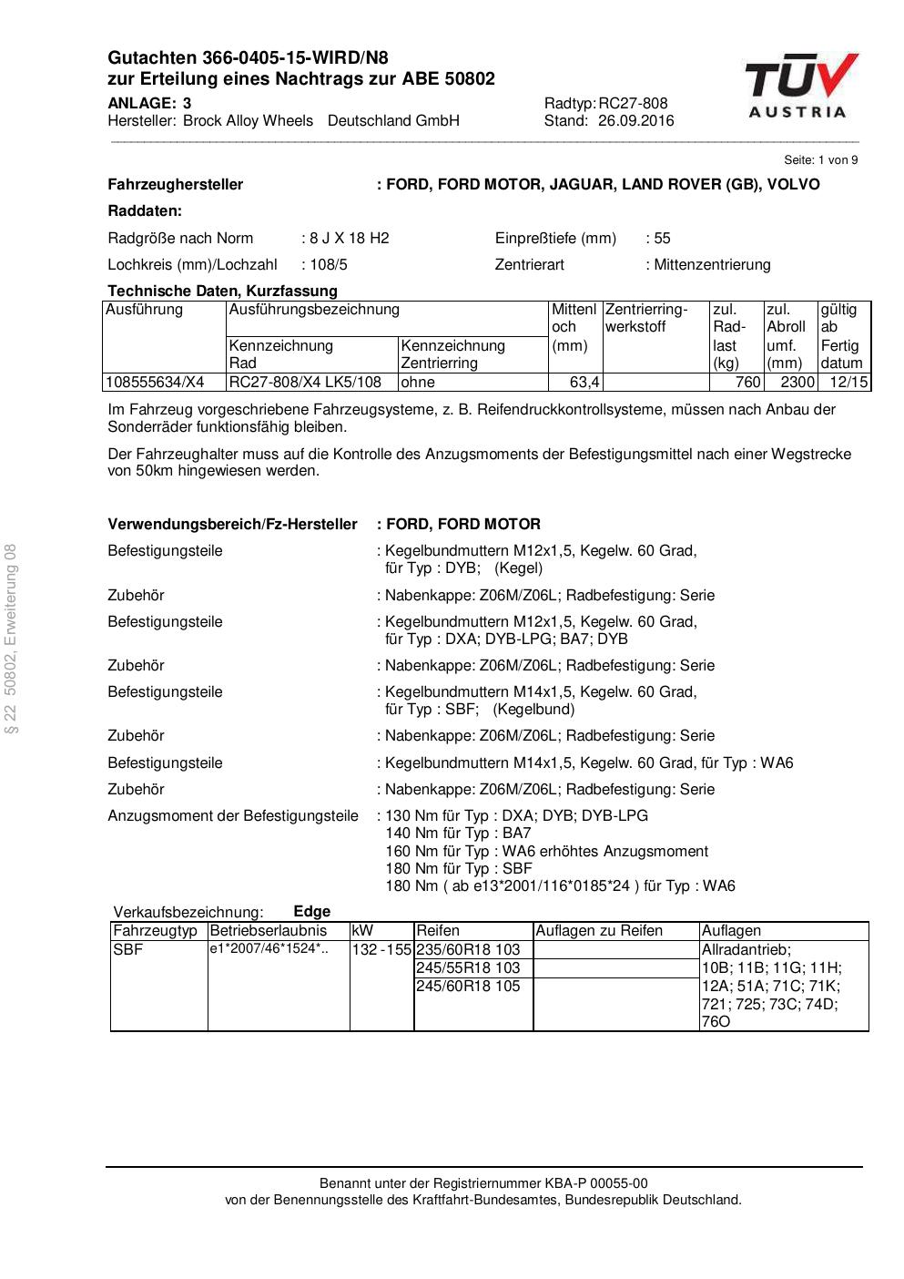 Dieses Gutachten (abe) bezieht sich auf die Alufelge Brock RC27-808 in der Ausführung 8Jx18 ET 0, Mittenloch 0 mm (KBA 50802). Im PDF findest du typischerweise zulässige Reifengrößen, Auflagen/Anbauhinweise und – je nach Dokument – Hinweise zur Eintragung.