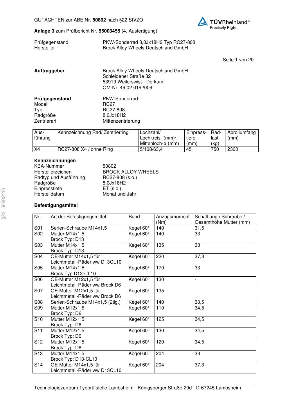 Dieses Gutachten (abe) bezieht sich auf die Alufelge Brock RC27-808 in der Ausführung 8Jx18 ET 0, Mittenloch 0 mm (KBA 50802). Im PDF findest du typischerweise zulässige Reifengrößen, Auflagen/Anbauhinweise und – je nach Dokument – Hinweise zur Eintragung.