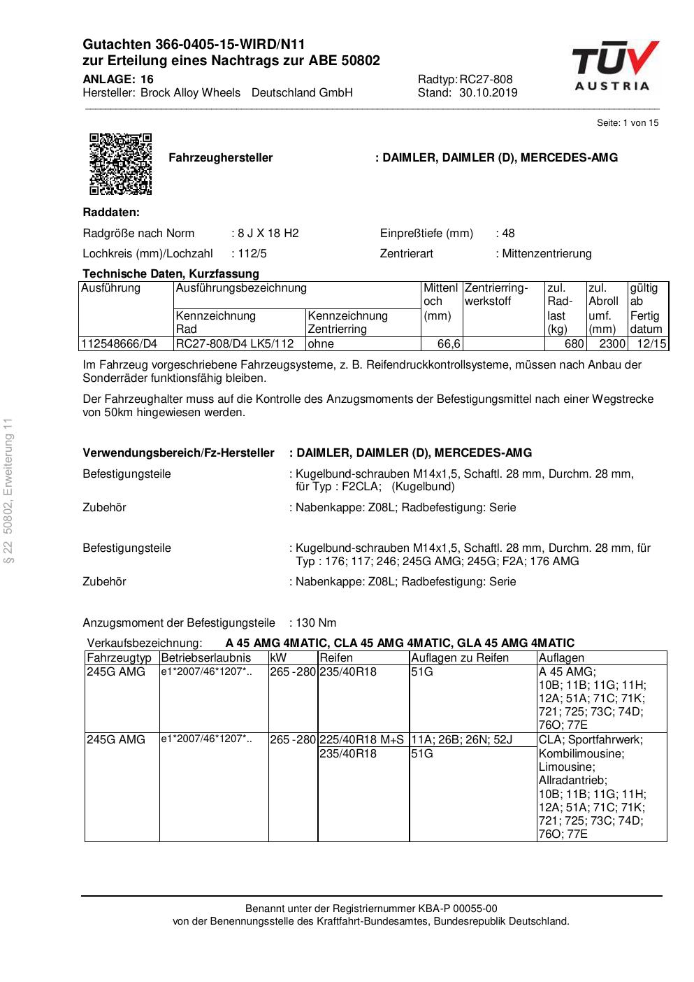 Dieses Gutachten (abe) bezieht sich auf die Alufelge Brock RC27-808 in der Ausführung 8Jx18 ET 0, Mittenloch 0 mm (KBA 50802). Im PDF findest du typischerweise zulässige Reifengrößen, Auflagen/Anbauhinweise und – je nach Dokument – Hinweise zur Eintragung.