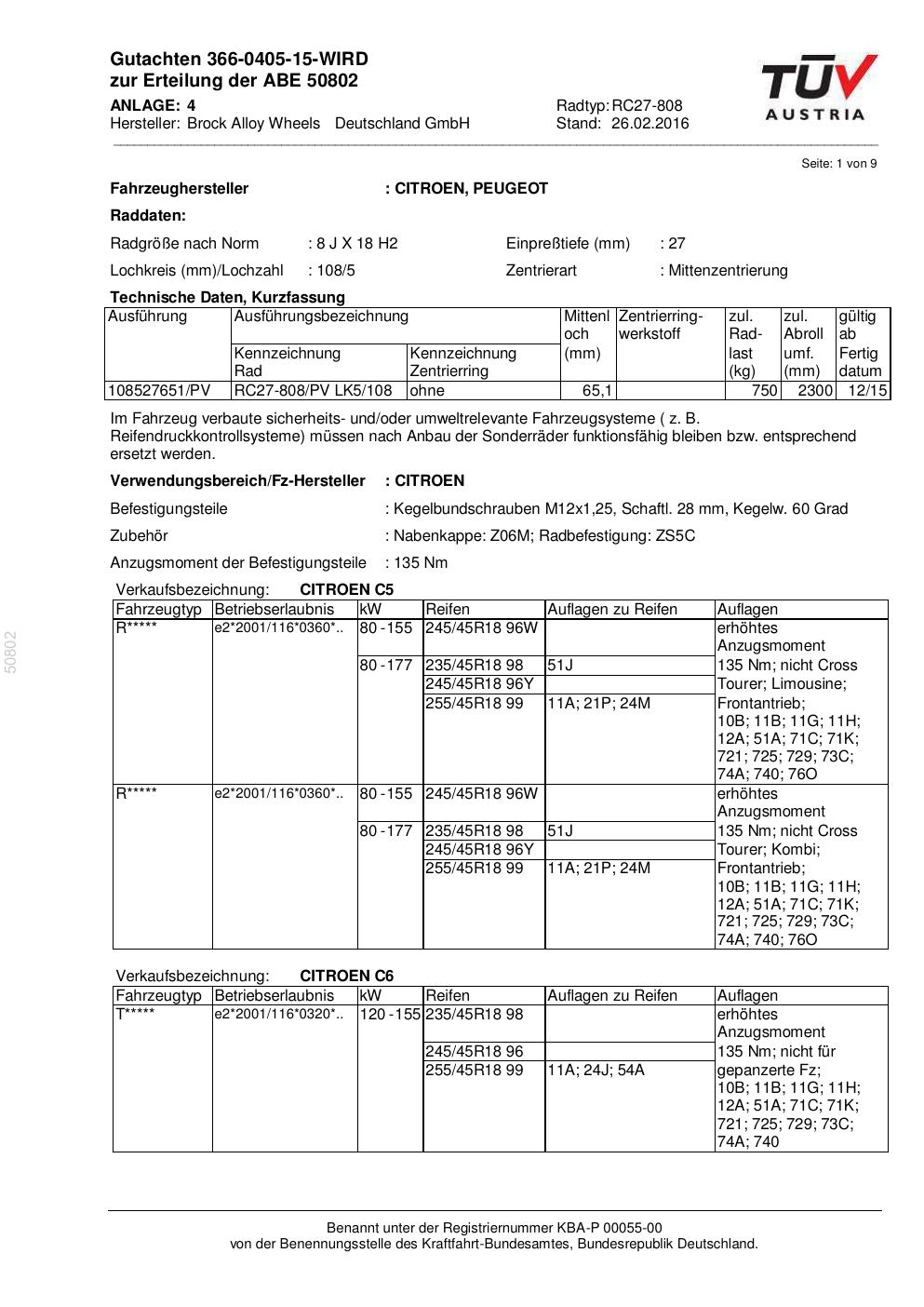 Dieses Gutachten (abe) bezieht sich auf die Alufelge Brock RC27-808 in der Ausführung 8Jx18 ET 0, Mittenloch 0 mm (KBA 50802). Im PDF findest du typischerweise zulässige Reifengrößen, Auflagen/Anbauhinweise und – je nach Dokument – Hinweise zur Eintragung.