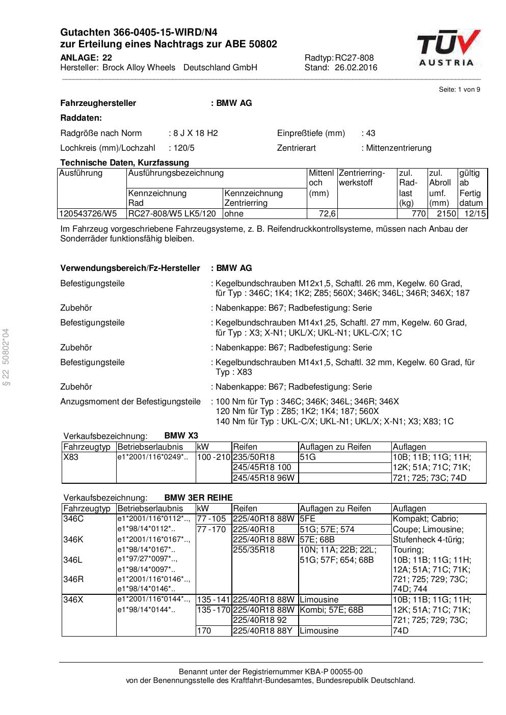 Dieses Gutachten (abe) bezieht sich auf die Alufelge Brock RC27-808 in der Ausführung 8Jx18 ET 0, Mittenloch 0 mm (KBA 50802). Im PDF findest du typischerweise zulässige Reifengrößen, Auflagen/Anbauhinweise und – je nach Dokument – Hinweise zur Eintragung.
