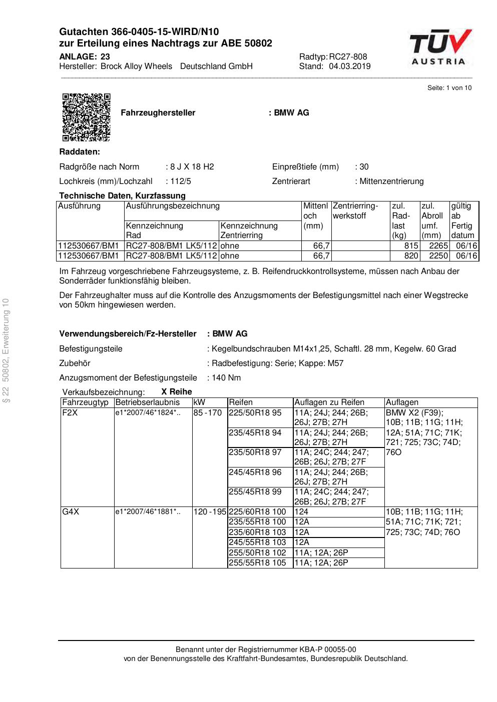 Dieses Gutachten (abe) bezieht sich auf die Alufelge Brock RC27-808 in der Ausführung 8Jx18 ET 0, Mittenloch 0 mm (KBA 50802). Im PDF findest du typischerweise zulässige Reifengrößen, Auflagen/Anbauhinweise und – je nach Dokument – Hinweise zur Eintragung.