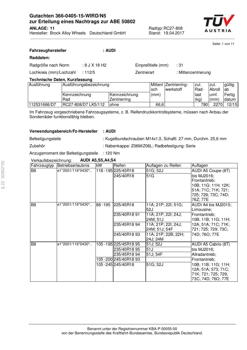 Dieses Gutachten (abe) bezieht sich auf die Alufelge Brock RC27-808 in der Ausführung 8Jx18 ET 0, Mittenloch 0 mm (KBA 50802). Im PDF findest du typischerweise zulässige Reifengrößen, Auflagen/Anbauhinweise und – je nach Dokument – Hinweise zur Eintragung.