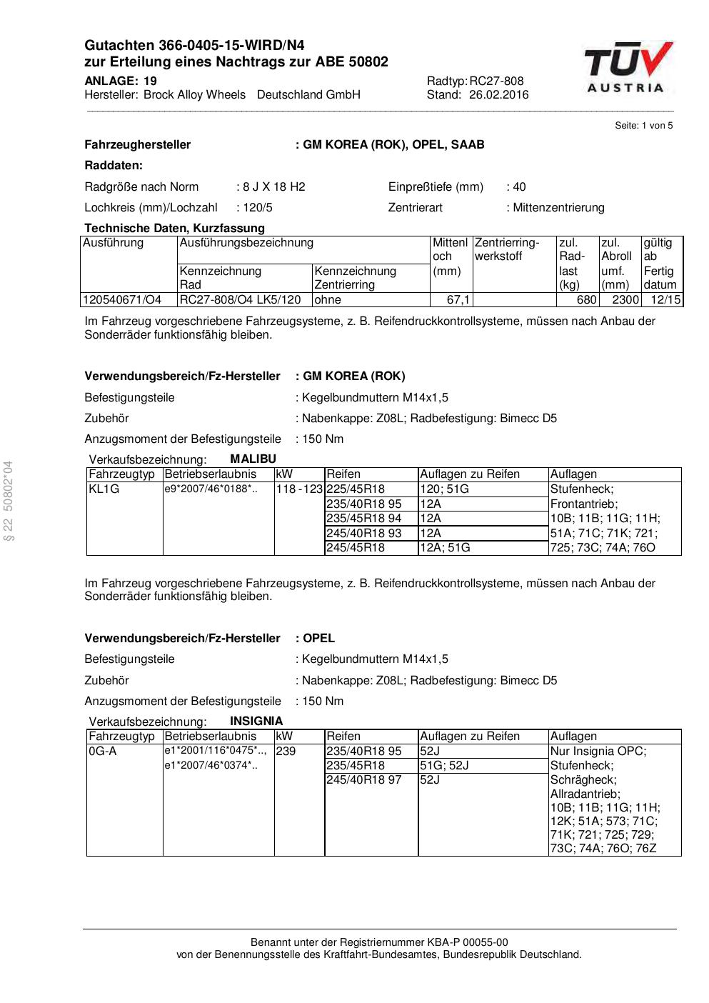 Dieses Gutachten (abe) bezieht sich auf die Alufelge Brock RC27-808 in der Ausführung 8Jx18 ET 0, Mittenloch 0 mm (KBA 50802). Im PDF findest du typischerweise zulässige Reifengrößen, Auflagen/Anbauhinweise und – je nach Dokument – Hinweise zur Eintragung.