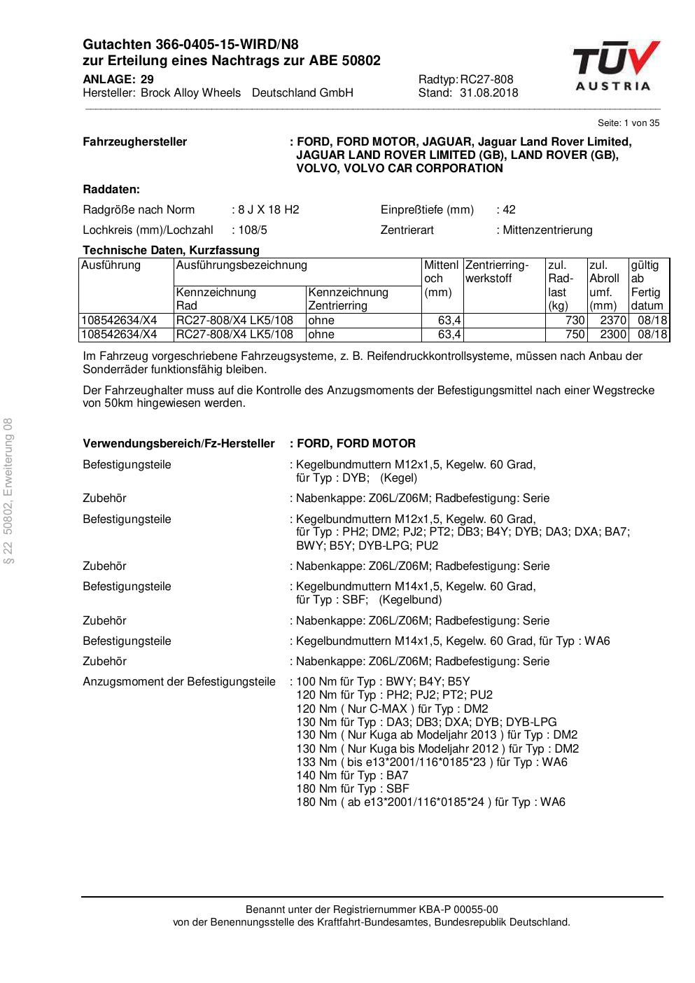 Dieses Gutachten (abe) bezieht sich auf die Alufelge Brock RC27-808 in der Ausführung 8Jx18 ET 0, Mittenloch 0 mm (KBA 50802). Im PDF findest du typischerweise zulässige Reifengrößen, Auflagen/Anbauhinweise und – je nach Dokument – Hinweise zur Eintragung.