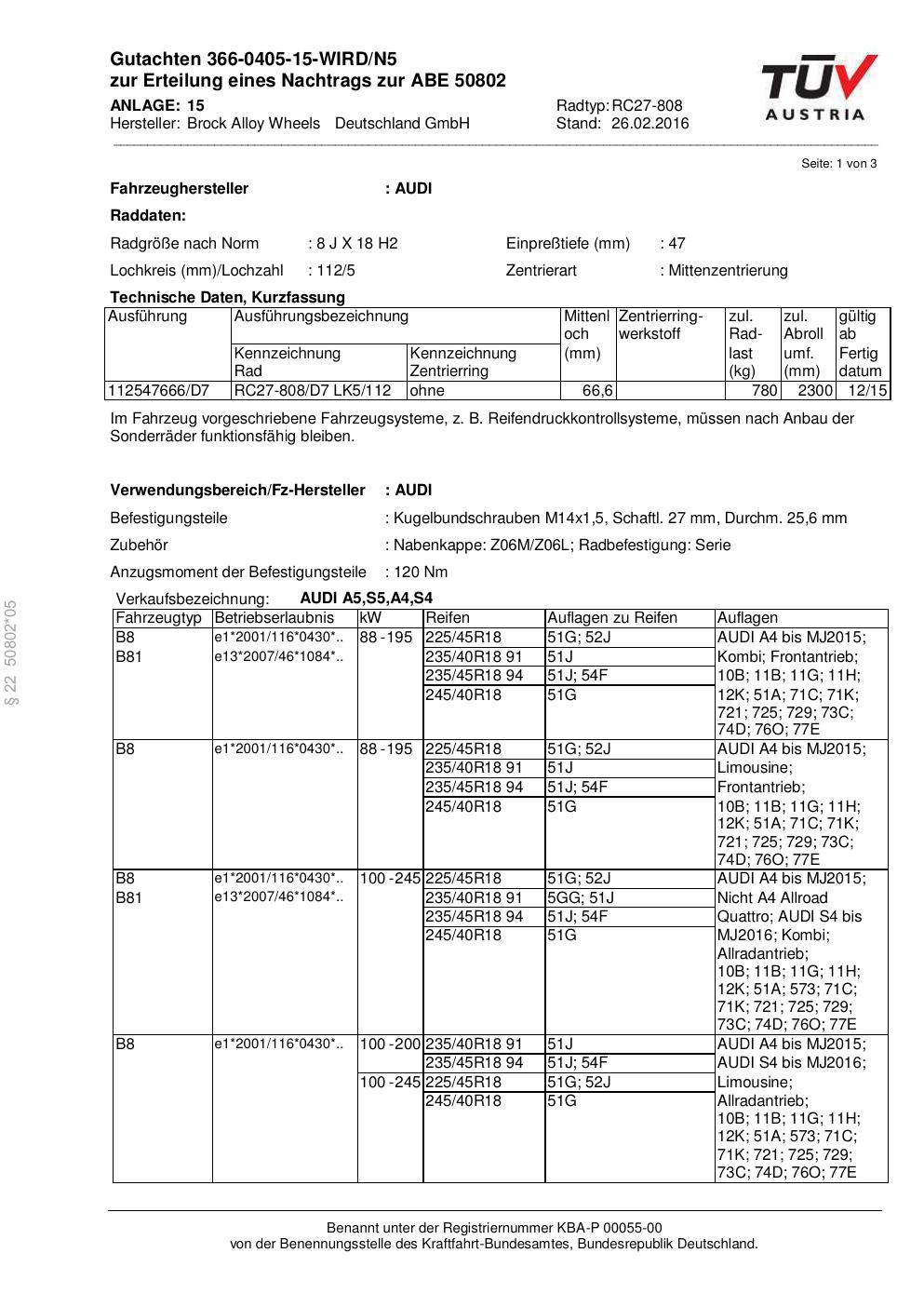Dieses Gutachten (abe) bezieht sich auf die Alufelge Brock RC27-808 in der Ausführung 8Jx18 ET 0, Mittenloch 0 mm (KBA 50802). Im PDF findest du typischerweise zulässige Reifengrößen, Auflagen/Anbauhinweise und – je nach Dokument – Hinweise zur Eintragung.