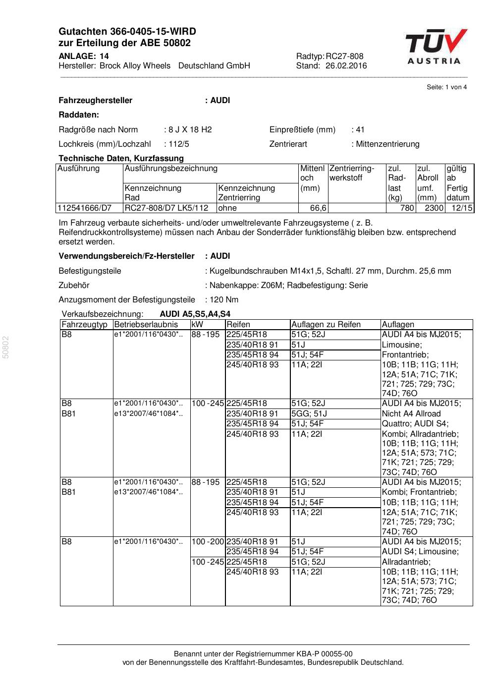Dieses Gutachten (abe) bezieht sich auf die Alufelge Brock RC27-808 in der Ausführung 8Jx18 ET 0, Mittenloch 0 mm (KBA 50802). Im PDF findest du typischerweise zulässige Reifengrößen, Auflagen/Anbauhinweise und – je nach Dokument – Hinweise zur Eintragung.