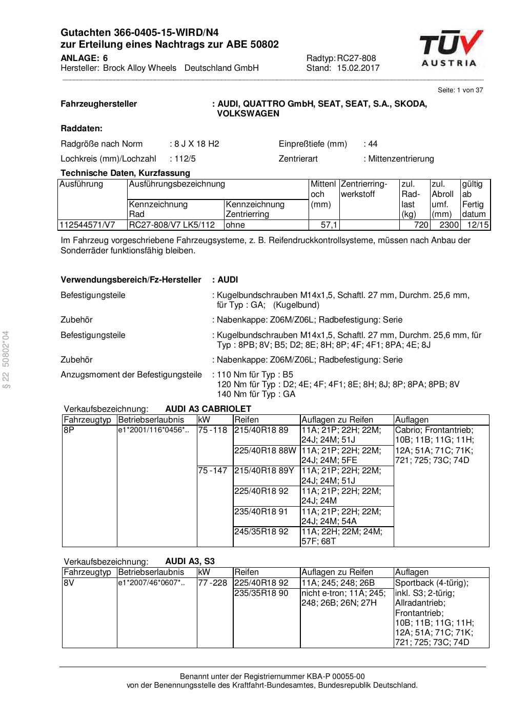 Dieses Gutachten (abe) bezieht sich auf die Alufelge Brock RC27-808 in der Ausführung 8Jx18 ET 0, Mittenloch 0 mm (KBA 50802). Im PDF findest du typischerweise zulässige Reifengrößen, Auflagen/Anbauhinweise und – je nach Dokument – Hinweise zur Eintragung.