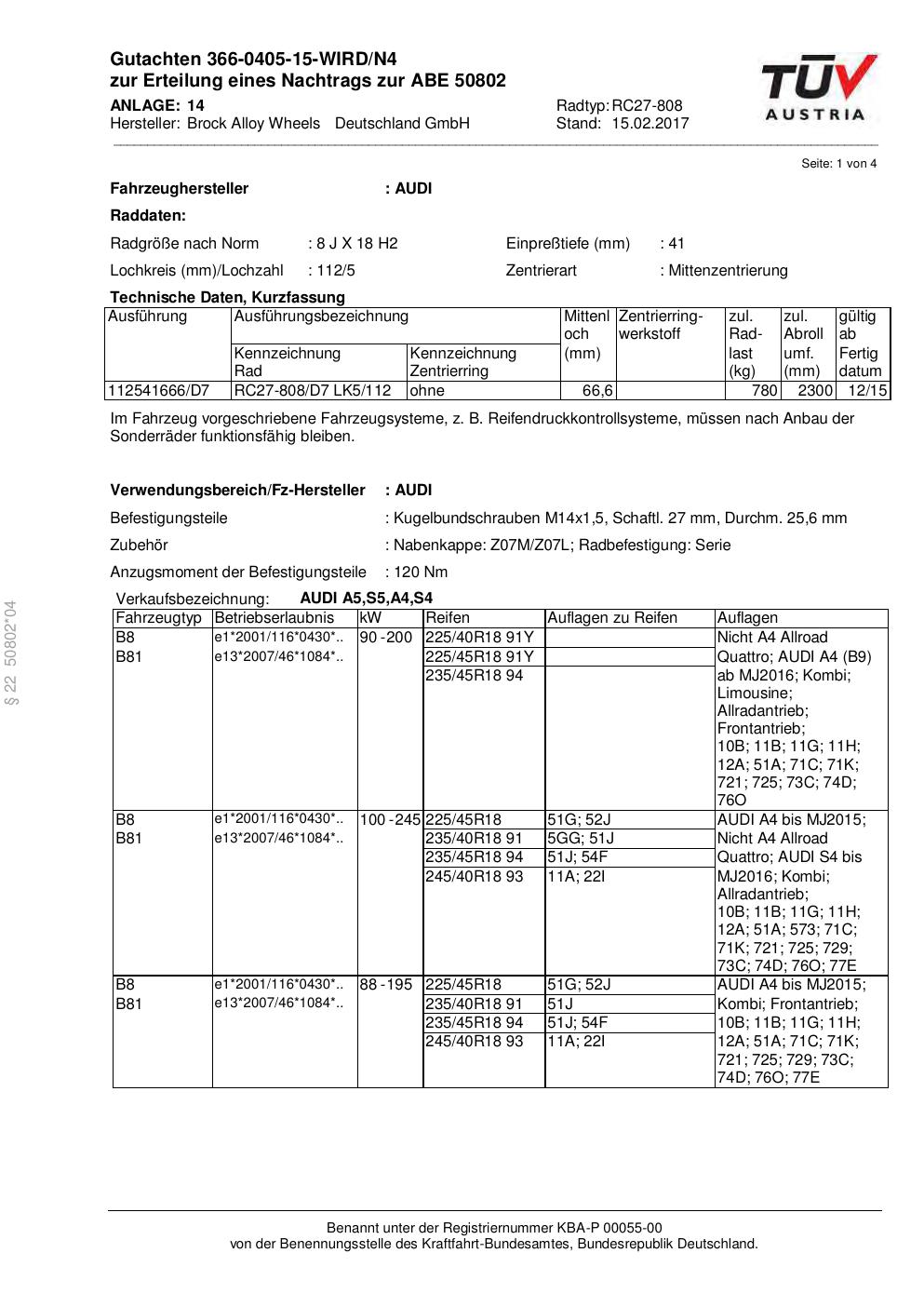 Dieses Gutachten (abe) bezieht sich auf die Alufelge Brock RC27-808 in der Ausführung 8Jx18 ET 0, Mittenloch 0 mm (KBA 50802). Im PDF findest du typischerweise zulässige Reifengrößen, Auflagen/Anbauhinweise und – je nach Dokument – Hinweise zur Eintragung.