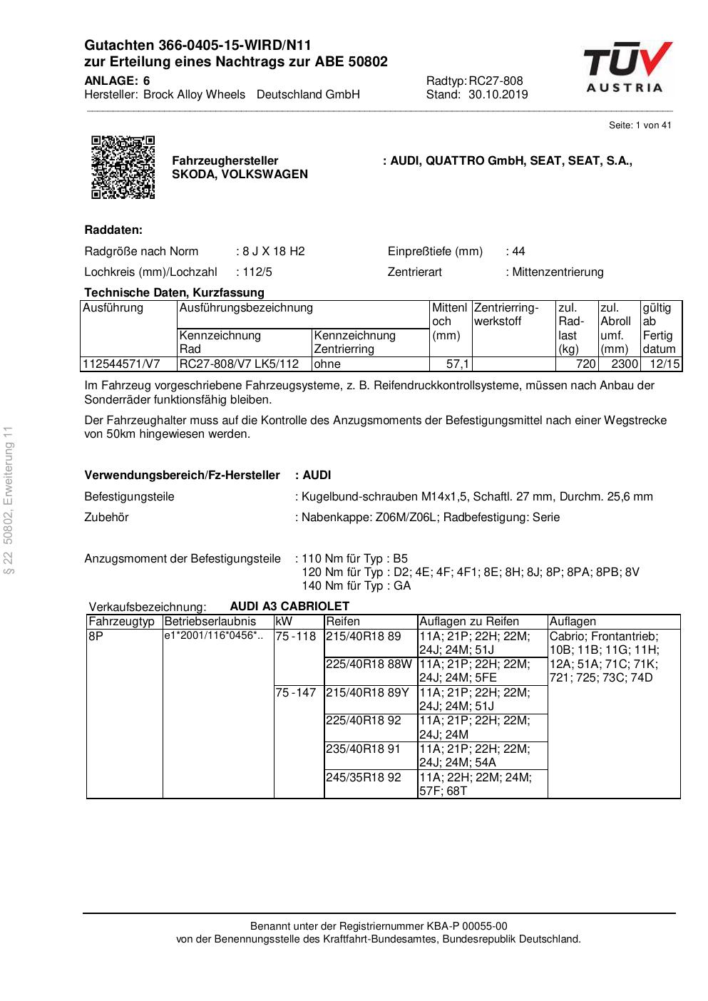 Dieses Gutachten (abe) bezieht sich auf die Alufelge Brock RC27-808 in der Ausführung 8Jx18 ET 0, Mittenloch 0 mm (KBA 50802). Im PDF findest du typischerweise zulässige Reifengrößen, Auflagen/Anbauhinweise und – je nach Dokument – Hinweise zur Eintragung.