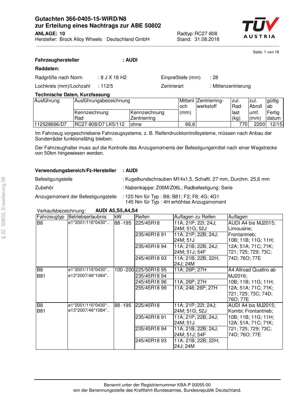 Dieses Gutachten (abe) bezieht sich auf die Alufelge Brock RC27-808 in der Ausführung 8Jx18 ET 0, Mittenloch 0 mm (KBA 50802). Im PDF findest du typischerweise zulässige Reifengrößen, Auflagen/Anbauhinweise und – je nach Dokument – Hinweise zur Eintragung.