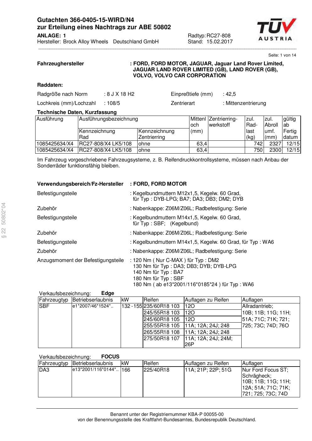 Dieses Gutachten (abe) bezieht sich auf die Alufelge Brock RC27-808 in der Ausführung 8Jx18 ET 0, Mittenloch 0 mm (KBA 50802). Im PDF findest du typischerweise zulässige Reifengrößen, Auflagen/Anbauhinweise und – je nach Dokument – Hinweise zur Eintragung.