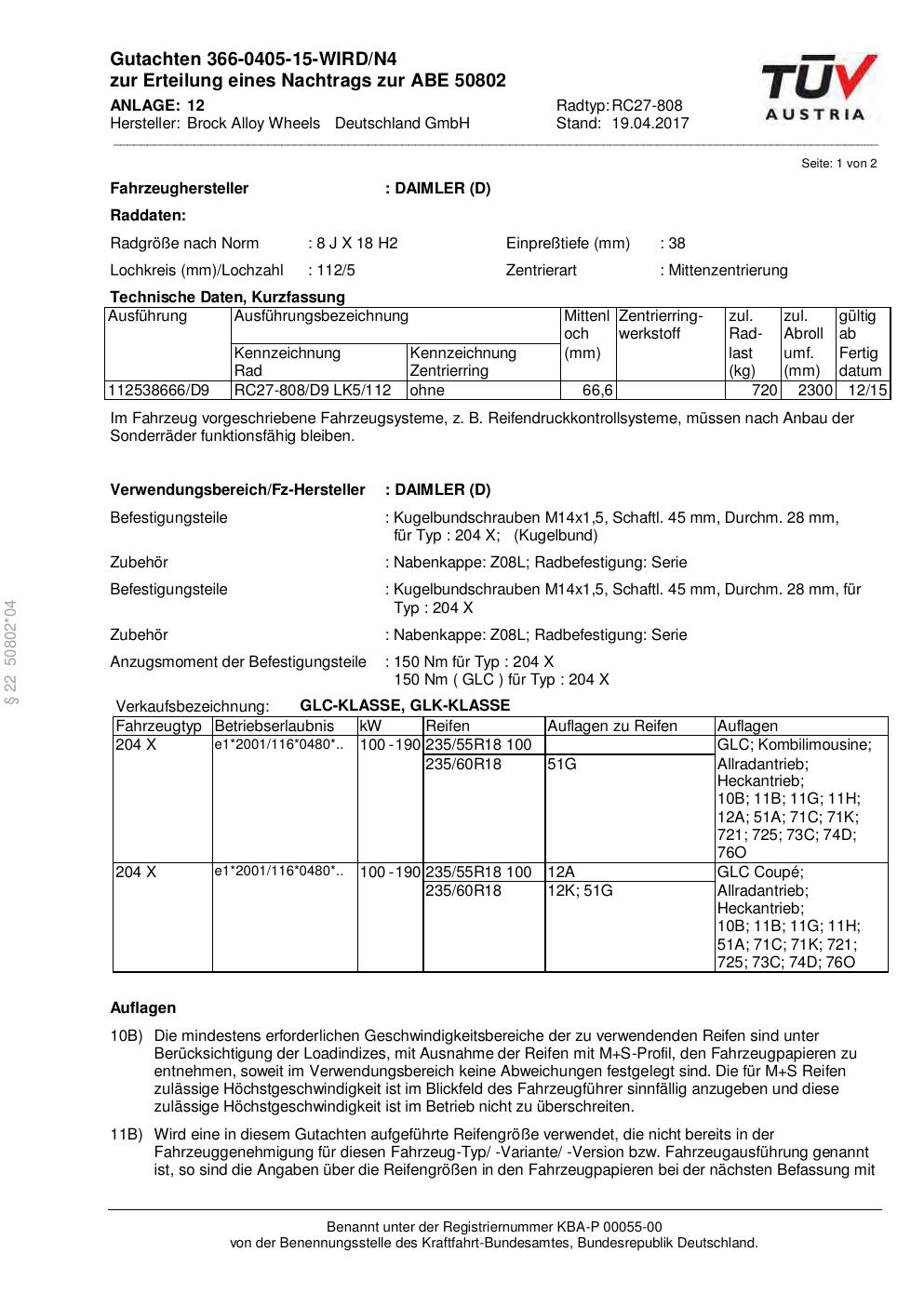 Dieses Gutachten (abe) bezieht sich auf die Alufelge Brock RC27-808 in der Ausführung 8Jx18 ET 0, Mittenloch 0 mm (KBA 50802). Im PDF findest du typischerweise zulässige Reifengrößen, Auflagen/Anbauhinweise und – je nach Dokument – Hinweise zur Eintragung.