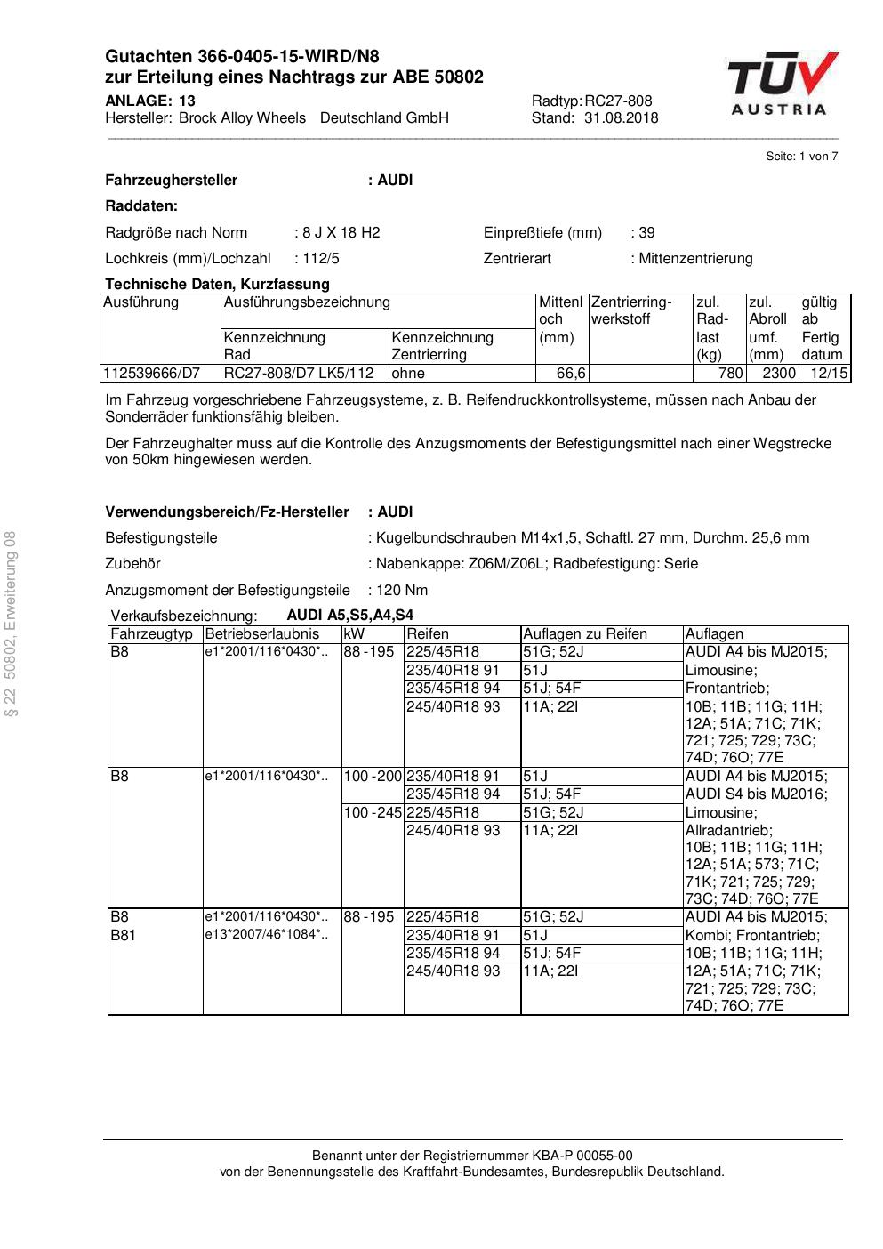 Dieses Gutachten (abe) bezieht sich auf die Alufelge Brock RC27-808 in der Ausführung 8Jx18 ET 0, Mittenloch 0 mm (KBA 50802). Im PDF findest du typischerweise zulässige Reifengrößen, Auflagen/Anbauhinweise und – je nach Dokument – Hinweise zur Eintragung.