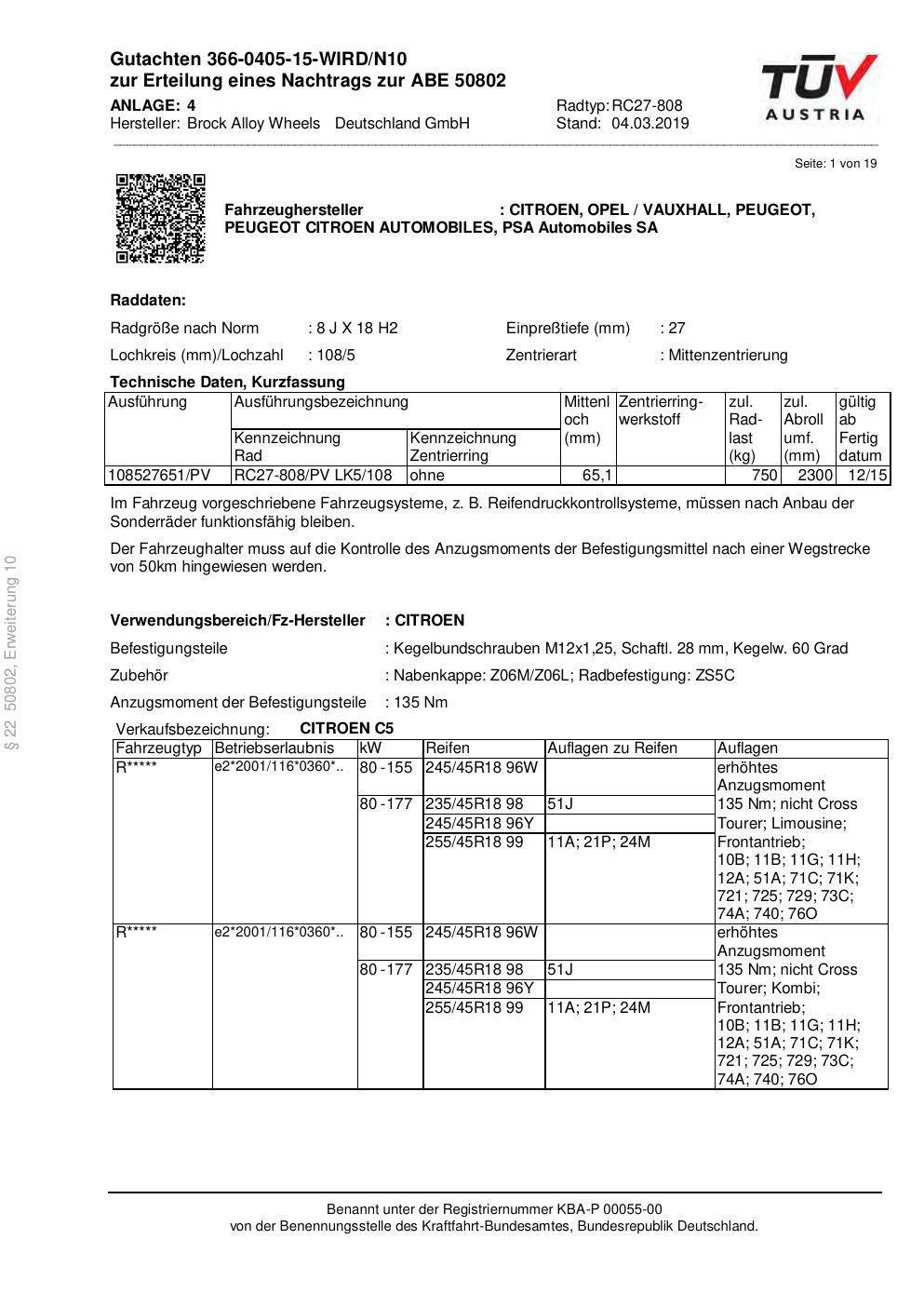Dieses Gutachten (abe) bezieht sich auf die Alufelge Brock RC27-808 in der Ausführung 8Jx18 ET 0, Mittenloch 0 mm (KBA 50802). Im PDF findest du typischerweise zulässige Reifengrößen, Auflagen/Anbauhinweise und – je nach Dokument – Hinweise zur Eintragung.