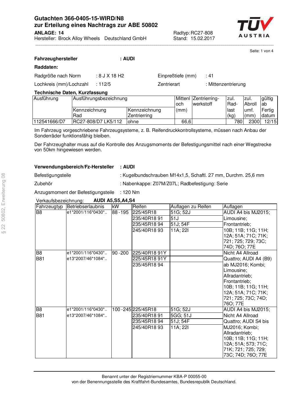 Dieses Gutachten (abe) bezieht sich auf die Alufelge Brock RC27-808 in der Ausführung 8Jx18 ET 0, Mittenloch 0 mm (KBA 50802). Im PDF findest du typischerweise zulässige Reifengrößen, Auflagen/Anbauhinweise und – je nach Dokument – Hinweise zur Eintragung.