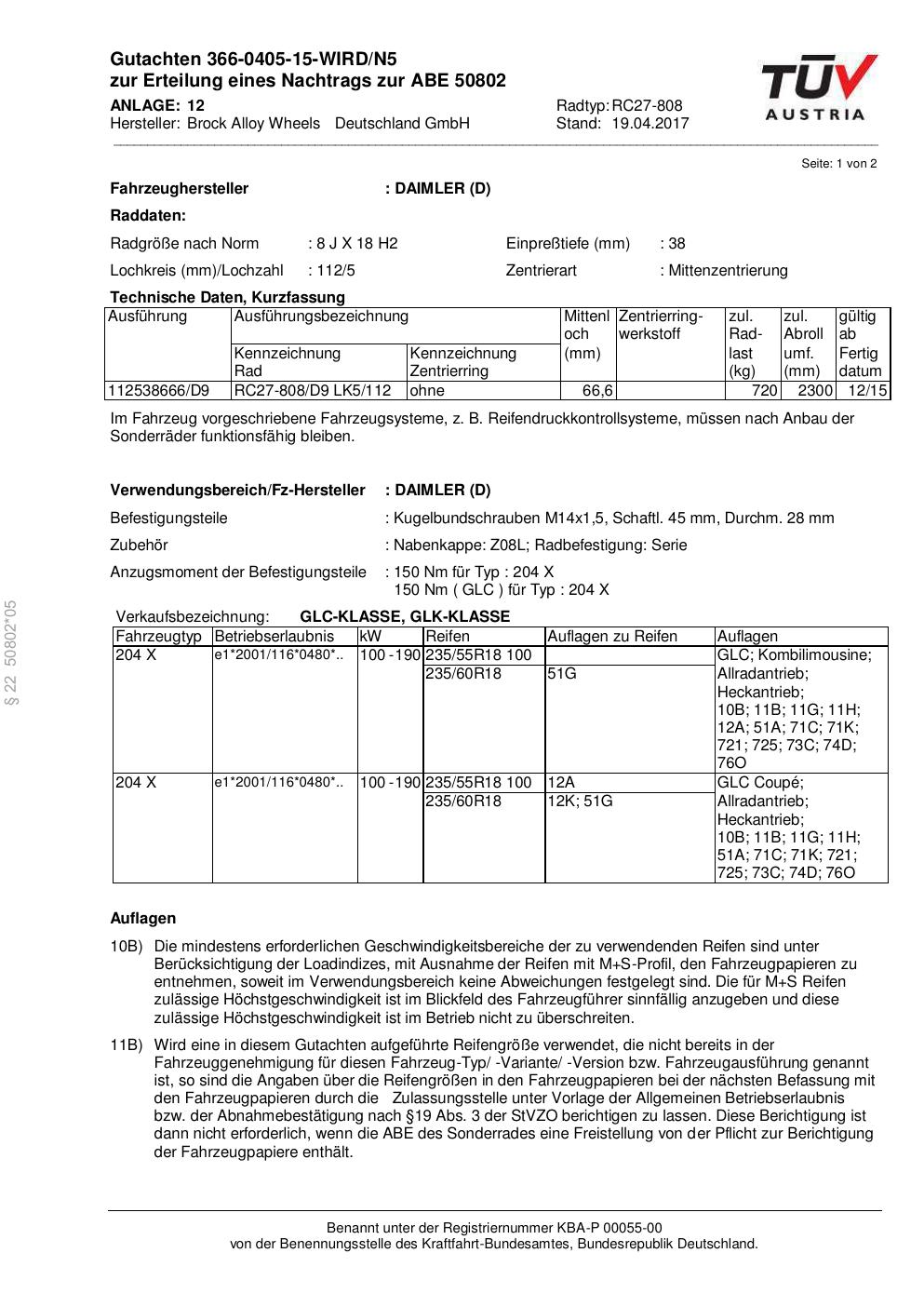 Dieses Gutachten (abe) bezieht sich auf die Alufelge Brock RC27-808 in der Ausführung 8Jx18 ET 0, Mittenloch 0 mm (KBA 50802). Im PDF findest du typischerweise zulässige Reifengrößen, Auflagen/Anbauhinweise und – je nach Dokument – Hinweise zur Eintragung.
