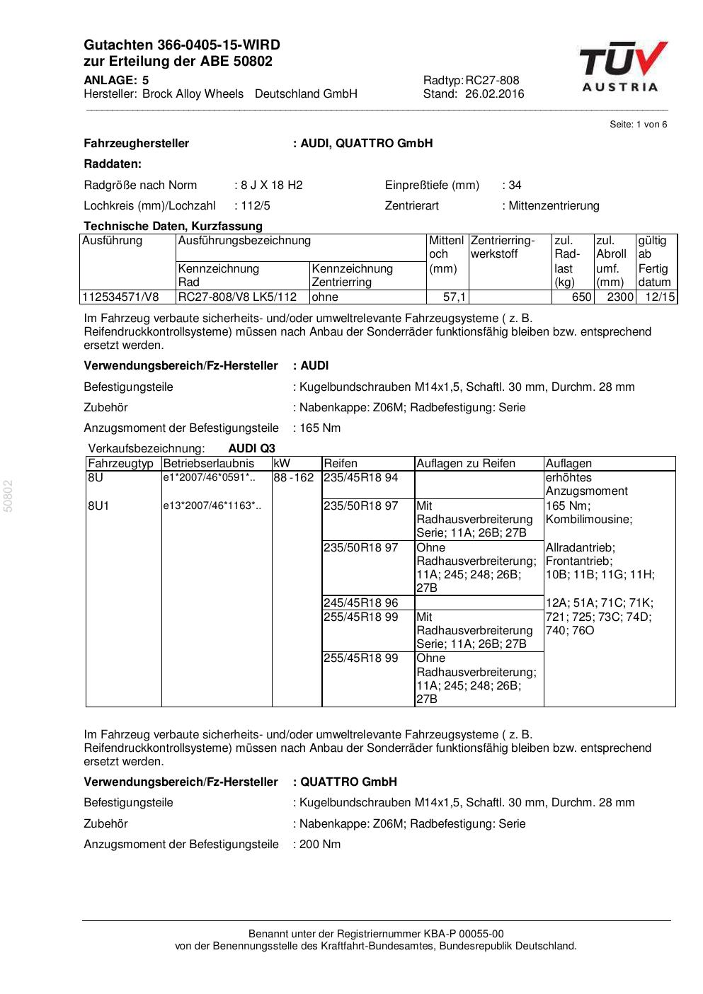 Dieses Gutachten (abe) bezieht sich auf die Alufelge Brock RC27-808 in der Ausführung 8Jx18 ET 0, Mittenloch 0 mm (KBA 50802). Im PDF findest du typischerweise zulässige Reifengrößen, Auflagen/Anbauhinweise und – je nach Dokument – Hinweise zur Eintragung.