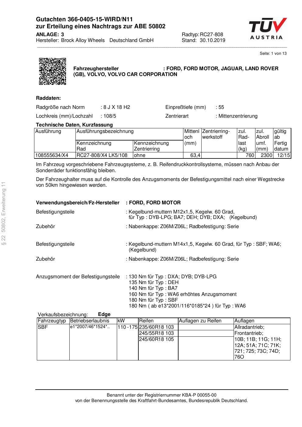 Dieses Gutachten (abe) bezieht sich auf die Alufelge Brock RC27-808 in der Ausführung 8Jx18 ET 0, Mittenloch 0 mm (KBA 50802). Im PDF findest du typischerweise zulässige Reifengrößen, Auflagen/Anbauhinweise und – je nach Dokument – Hinweise zur Eintragung.