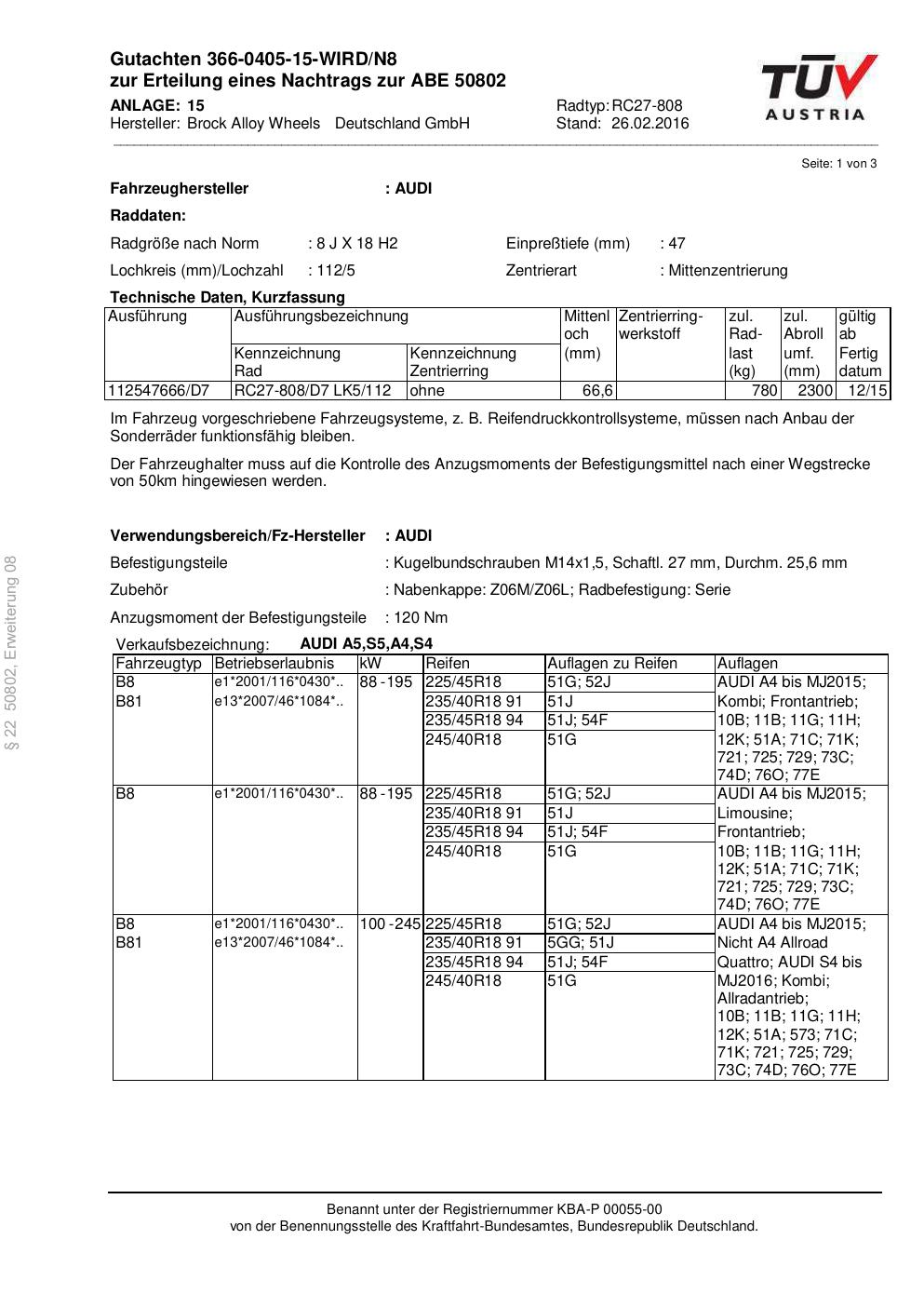 Dieses Gutachten (abe) bezieht sich auf die Alufelge Brock RC27-808 in der Ausführung 8Jx18 ET 0, Mittenloch 0 mm (KBA 50802). Im PDF findest du typischerweise zulässige Reifengrößen, Auflagen/Anbauhinweise und – je nach Dokument – Hinweise zur Eintragung.