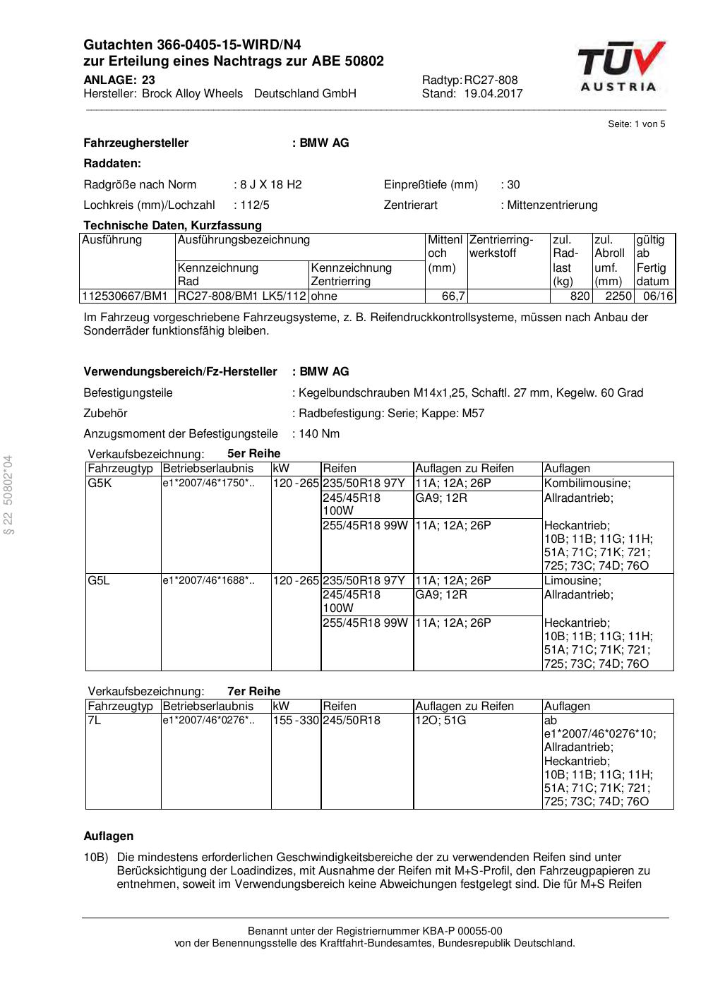 Felgengutachten / abe für Alufelgen Brock RC27-808 (8Jx18 ET 0, Mittenloch 0 mm) mit KBA 50802 (Zertifikatsnummer 50802). Hier kostenlos als PDF herunterladen. Der Download-Link ist 24 Stunden gültig und kann bis zu zwei Mal verwendet werden.