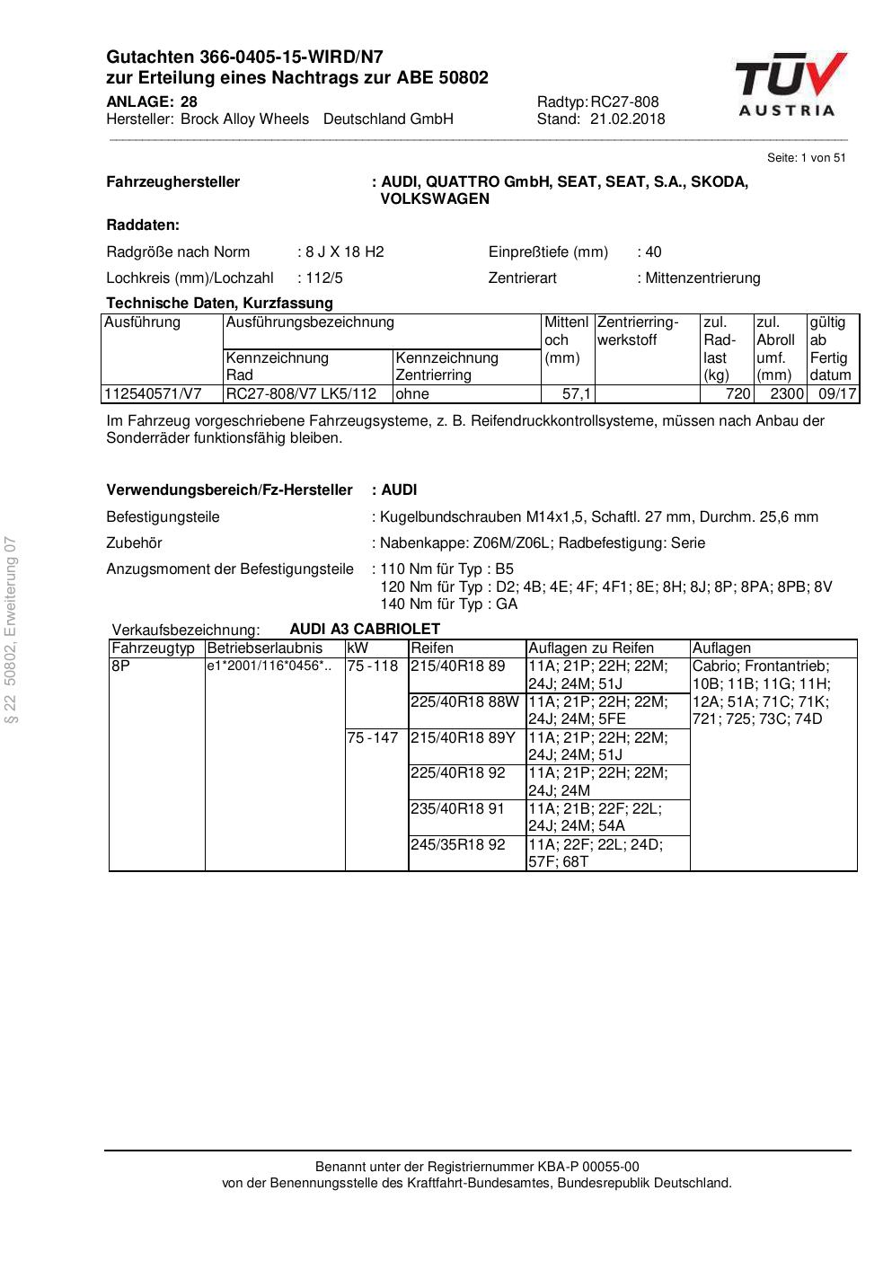 Dieses Gutachten (abe) bezieht sich auf die Alufelge Brock RC27-808 in der Ausführung 8Jx18 ET 0, Mittenloch 0 mm (KBA 50802). Im PDF findest du typischerweise zulässige Reifengrößen, Auflagen/Anbauhinweise und – je nach Dokument – Hinweise zur Eintragung.