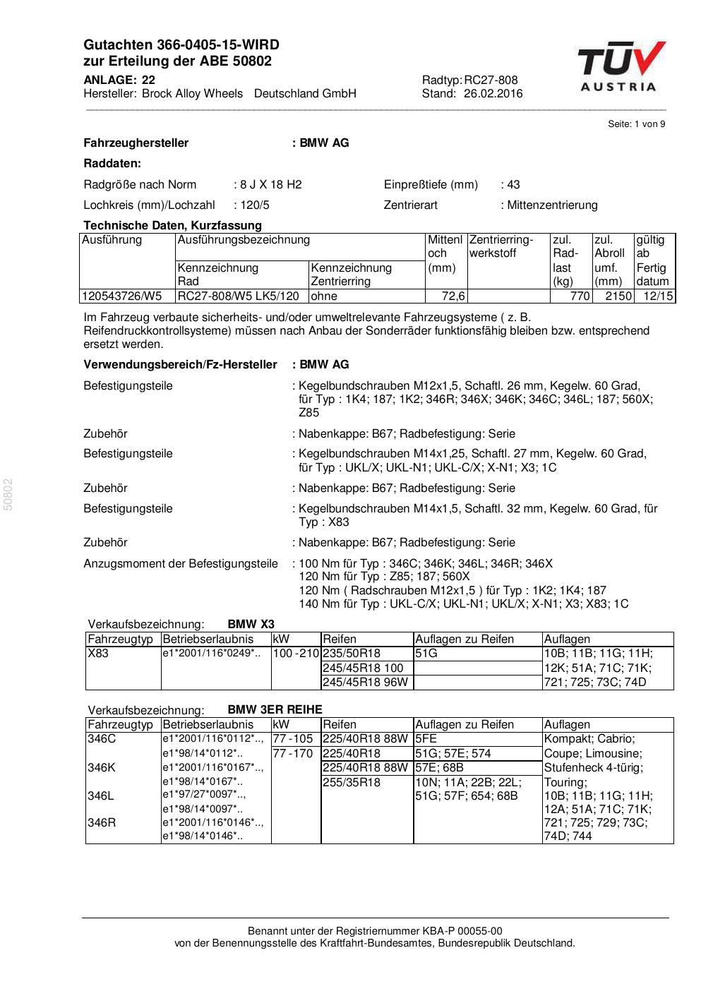 Dieses Gutachten (abe) bezieht sich auf die Alufelge Brock RC27-808 in der Ausführung 8Jx18 ET 0, Mittenloch 0 mm (KBA 50802). Im PDF findest du typischerweise zulässige Reifengrößen, Auflagen/Anbauhinweise und – je nach Dokument – Hinweise zur Eintragung.