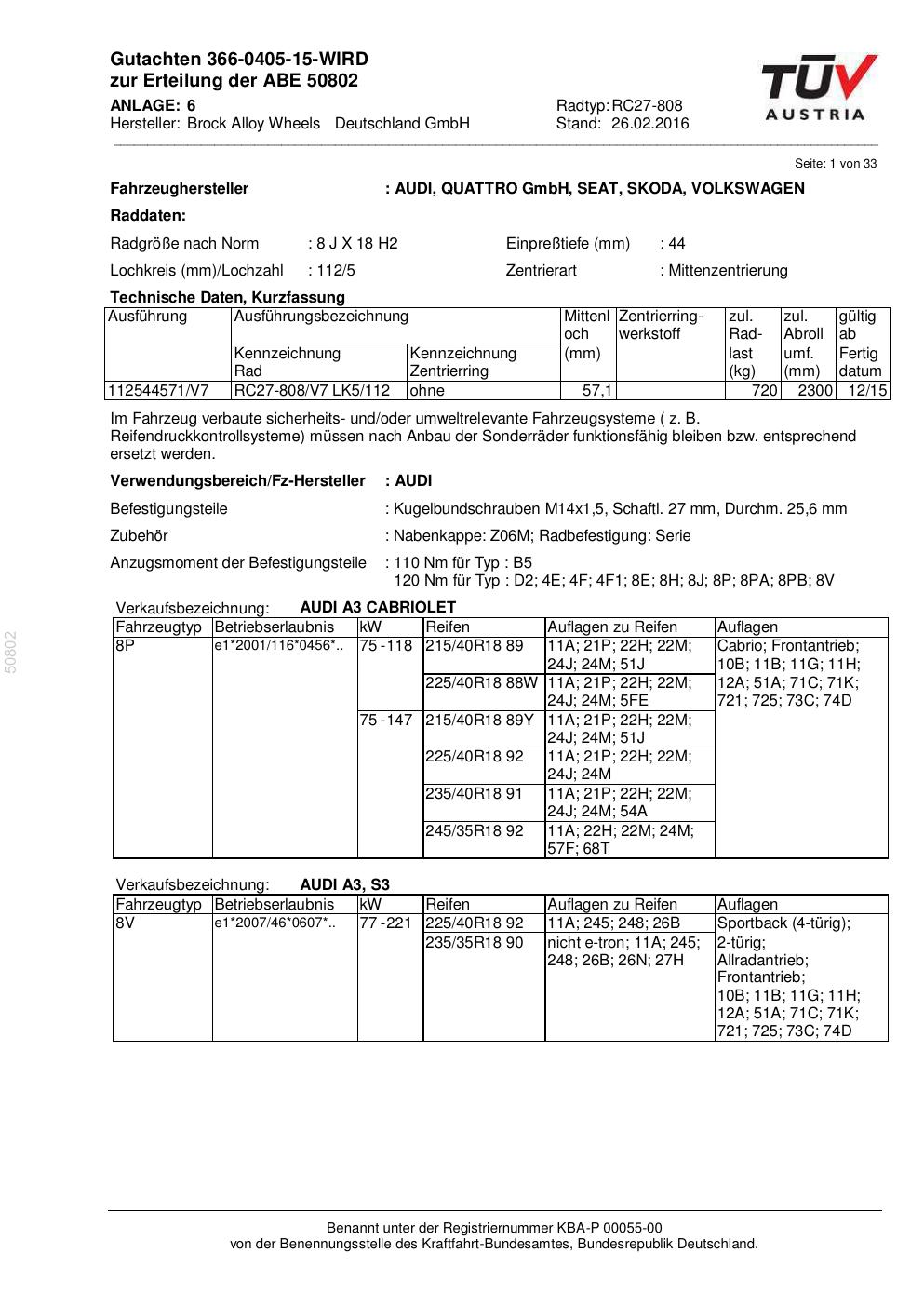 Dieses Gutachten (abe) bezieht sich auf die Alufelge Brock RC27-808 in der Ausführung 8Jx18 ET 0, Mittenloch 0 mm (KBA 50802). Im PDF findest du typischerweise zulässige Reifengrößen, Auflagen/Anbauhinweise und – je nach Dokument – Hinweise zur Eintragung.