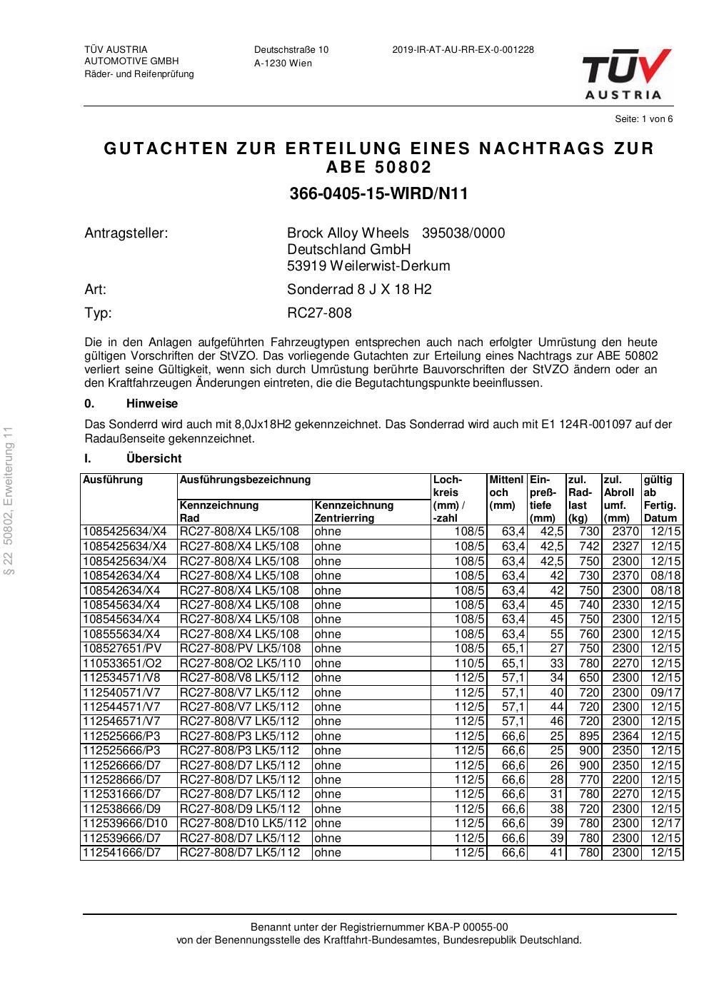 Dieses Gutachten (abe) bezieht sich auf die Alufelge Brock RC27-808 in der Ausführung 8Jx18 ET 0, Mittenloch 0 mm (KBA 50802). Im PDF findest du typischerweise zulässige Reifengrößen, Auflagen/Anbauhinweise und – je nach Dokument – Hinweise zur Eintragung.
