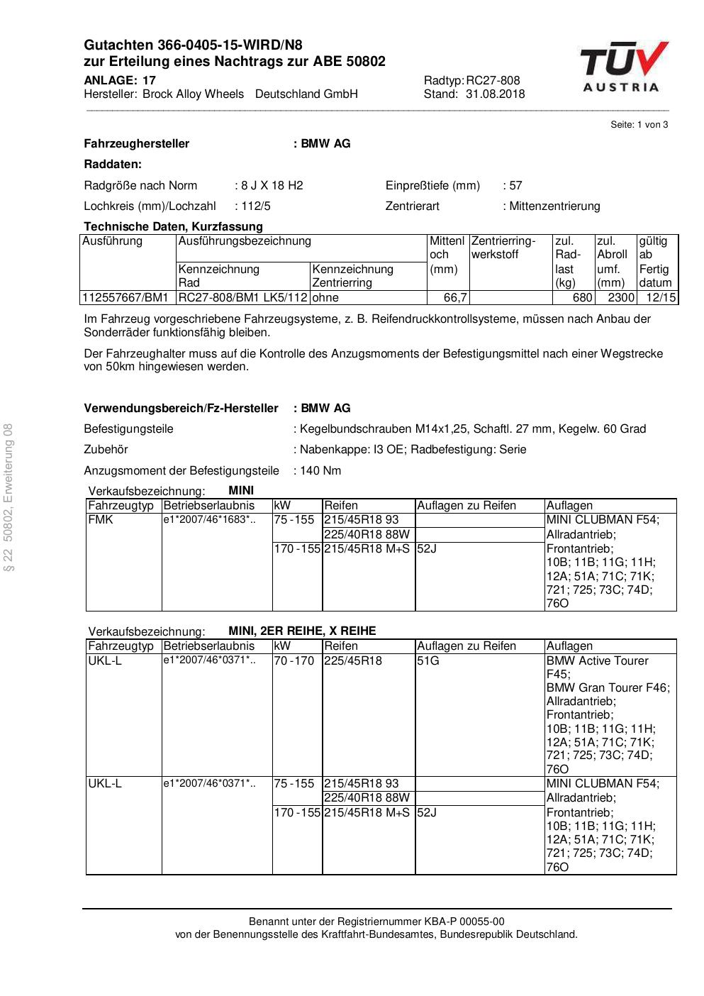 Dieses Gutachten (abe) bezieht sich auf die Alufelge Brock RC27-808 in der Ausführung 8Jx18 ET 0, Mittenloch 0 mm (KBA 50802). Im PDF findest du typischerweise zulässige Reifengrößen, Auflagen/Anbauhinweise und – je nach Dokument – Hinweise zur Eintragung.
