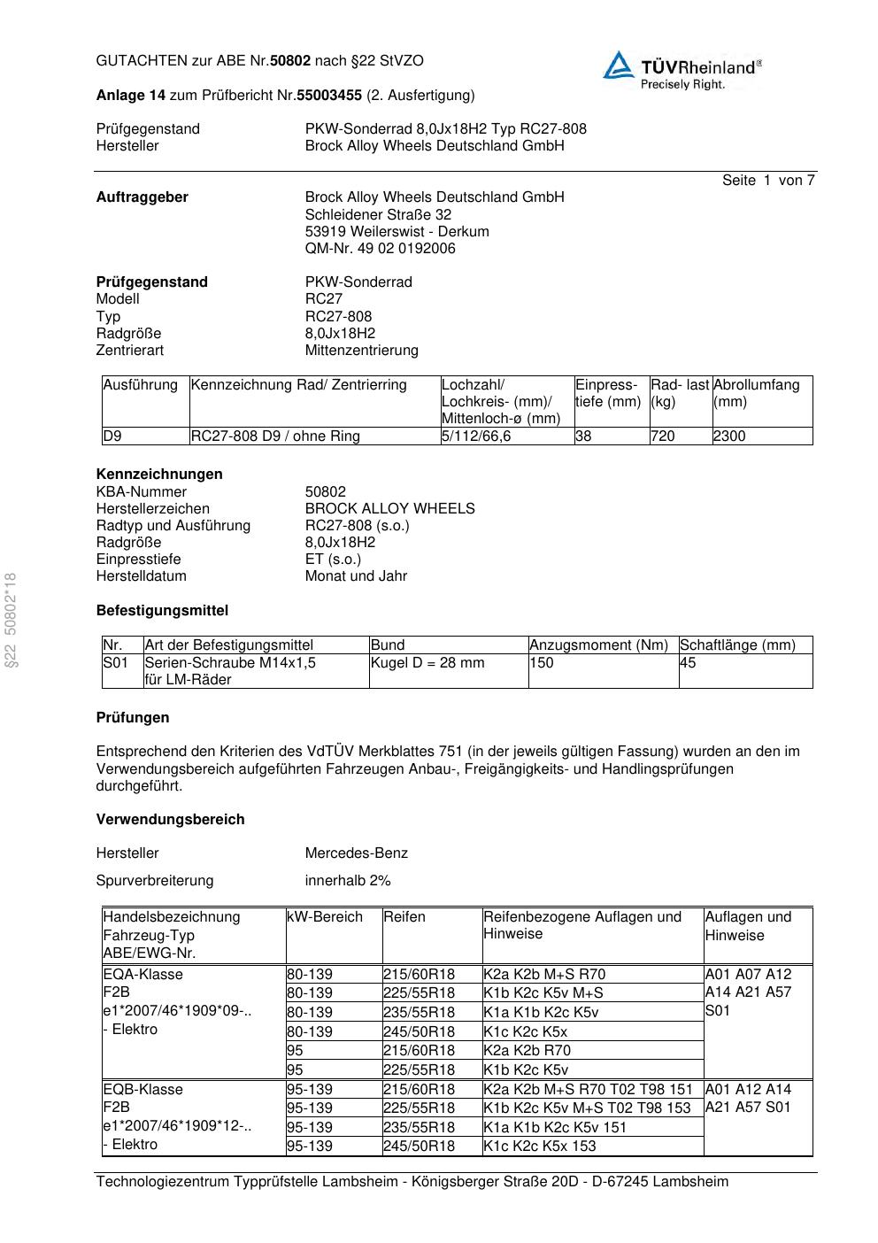Dieses Gutachten (abe) bezieht sich auf die Alufelge Brock RC27-808 in der Ausführung 8Jx18 ET 0, Mittenloch 0 mm (KBA 50802). Im PDF findest du typischerweise zulässige Reifengrößen, Auflagen/Anbauhinweise und – je nach Dokument – Hinweise zur Eintragung.